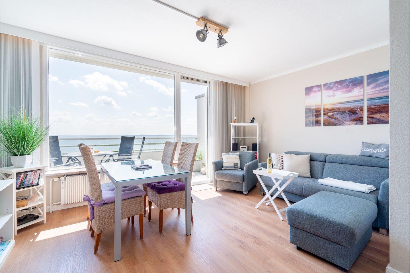 Die 55 qm große gemütliche Ferienwohnung bietet vom 8. Stock aus ein traumhaftes Panorama über die Ostsee - von Sonnenaufgang bis zum Nachmittag können Sie hier die Sonne genießen. Vom Wohnzimmer mit großem Panoramafenster haben Sie Zugang zum großzügigen Balkon, eine Markise ist vorhanden. Die kleine Küche mit Herd und Backofen ist in den Wohn- und Essbereich integriert. Das Schlafzimmer hat ein großes Doppelbett mit durchgängiger Matratze (180 x 200 cm) und ein Fenster mit Ostseeblick - aufwachen und das Meer sehen, so kann der Tag beginnen! Das Sofa im Wohnzimmer hat eine Schlaffunktion (140 x 200 cm). Das Wannenbad ist innenliegend. Der rechte Fahrstuhl fährt nur mit Schlüssel in die 8. Etage.