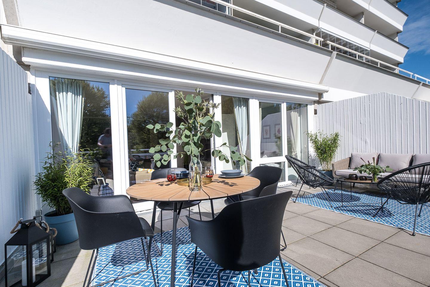 In der 3. Etage gelegen (und doch nur durch 4 Stufen erreichbar) bietet die Wohnung eine außergewöhnlich große, möblierte Terrasse mit Markise und Panoramablick ins Grüne. Bis zum späten Nachmittag scheint hier die Sonne und die 400m entfernte Ostsee lässt sich erblicken - an guten Tagen reicht die Sicht sogar bis Timmendorf. Der Hansapark ist ebenfalls nur 200m entfernt und lädt zu einer tollen Zeit für die ganze Familie ein.