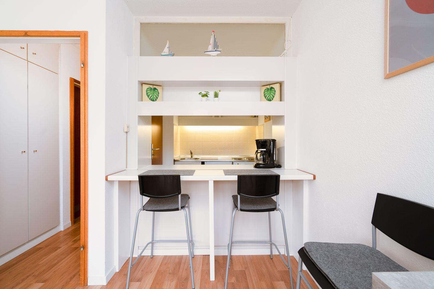 diese 1-Raum-Ferienwohnung liegt in der Apartmentanlage Ferienpark in der 1. Etage mit einem Balkon und Blick auf den Hansa Park. Die Wohnung ist ca. 33 qm groß und für 2 Erwachsene geeignet. Im kombinierten Wohn- und Schlafraum stehen Ihnen ein Doppelbett (2x 90 cm x 200 cm) und ein Zustellbett (90 cm x 190 cm) zur Verfügung. Ein Kinderbett gehört ebenfalls zur Ausstattung der Wohnung. Die Küche mit Esstresen ist zum Wohnraum hin offen und mit Backofen und Herd ausgestattet. Das Duschbad ist innenliegend. Zum Strand sind es nur wenige Gehminuten. PKW-Stellplatz inklusive.