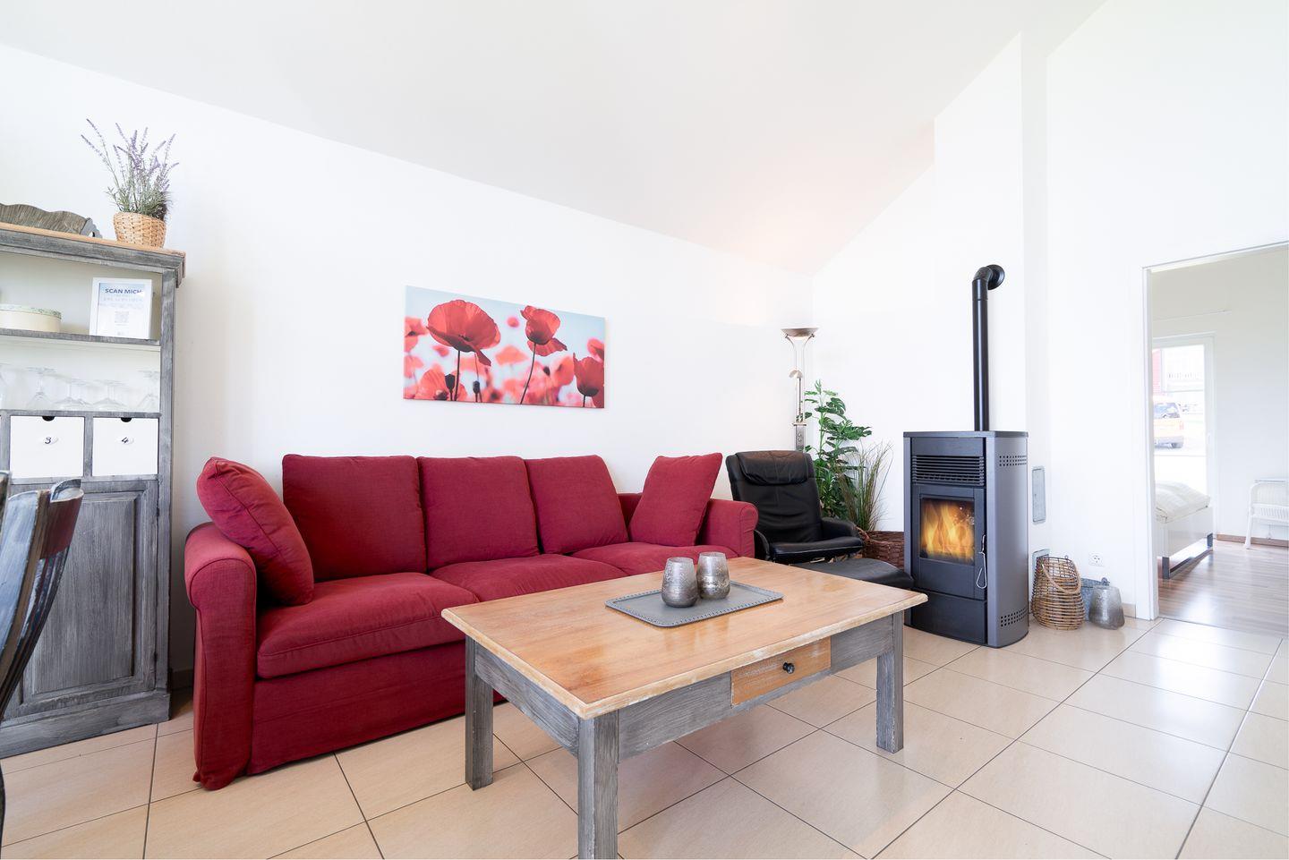 Vom geräumigen Wohn- und Essbereich mit offener Küche und Pelletofen haben Sie Zugang zur Terrasse. Diese verfügt über ausreichend Sitzmöglichkeiten und lädt zum Entspannen und Genießen der Ostseeluft ein - Meerblick inklusive. Der Ofen im Wohnbereich sorgt für gemütliche Stunden mit Freunden und Familie. Die moderne Küche ist mit Backofen, Herd und Spülmaschine voll ausgestattet. Das Haus hat zwei Schlafzimmer, eines mit einem Doppelbett (2x 90 x 200 cm) und eines mit zwei Einzelbetten und einem Zustellbett (jeweils 80 x 190 cm). Das Badezimmer verfügt über eine Badewanne und die Sauna. Der Komfort einer eigenen Sauna wird sehr von unseren Wintergästen geschätzt. Eine eigene Waschmaschine gehört ebenfalls zur Ausstattung des Hauses.