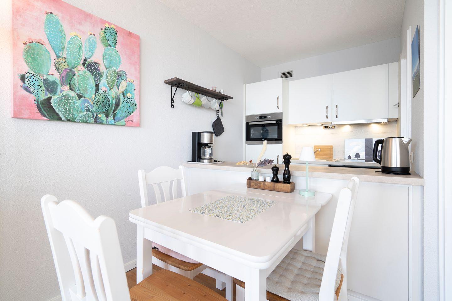 dieses im Jahr 2023 renovierte Feriendomizil befindet sich in der 6. Etage in 1. Reihe an der Ostsee. Vom gemütlichen und liebevoll eingerichteten Wohn- und Essbereich haben Sie Zugang zum Balkon mit herrlichem Ostseeblick. Die kleine, aber mit Spülmaschine, Backofen und Herd voll ausgestattete Küche ist offen zum Wohn-/Essbereich. Das Schlafzimmer hat ein Doppelbett (200 cm x 200 cm) und ein Fenster mit toller Sicht auf die Ostsee. Im Wohnzimmer steht ein Schlafsofa (120 cm x 200 cm). Das modernisierte Duschbad ist innenliegend. Zum Strand und zur Promenade sind es nur wenige Schritte. PKW-Stellplatz im Parkdeck, es führen Treppen von dort aus zur Wohnung. Über einen Seiteneingang gelangt man zum Fahrstuhl für ebenerdiges Be-und Entladen.