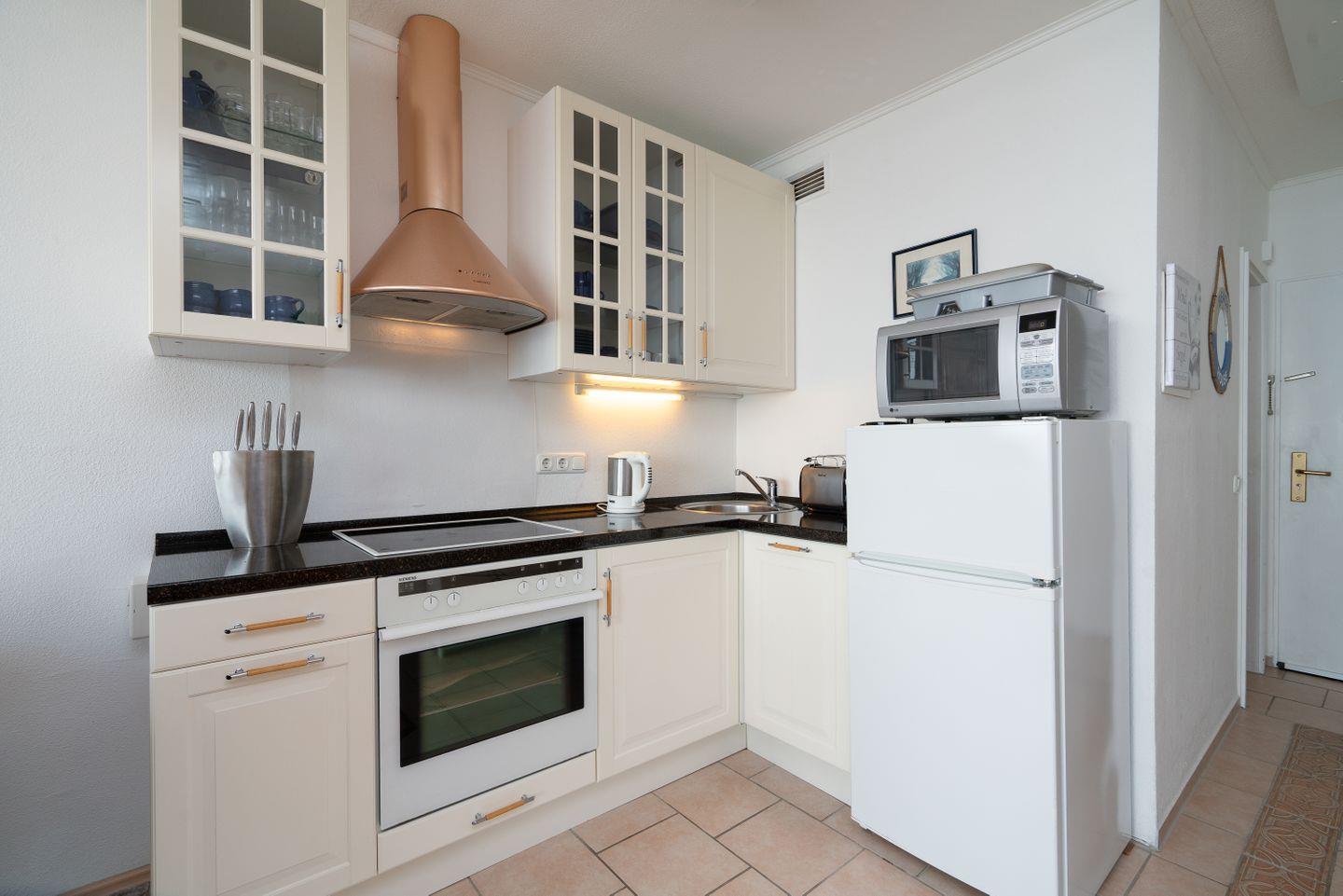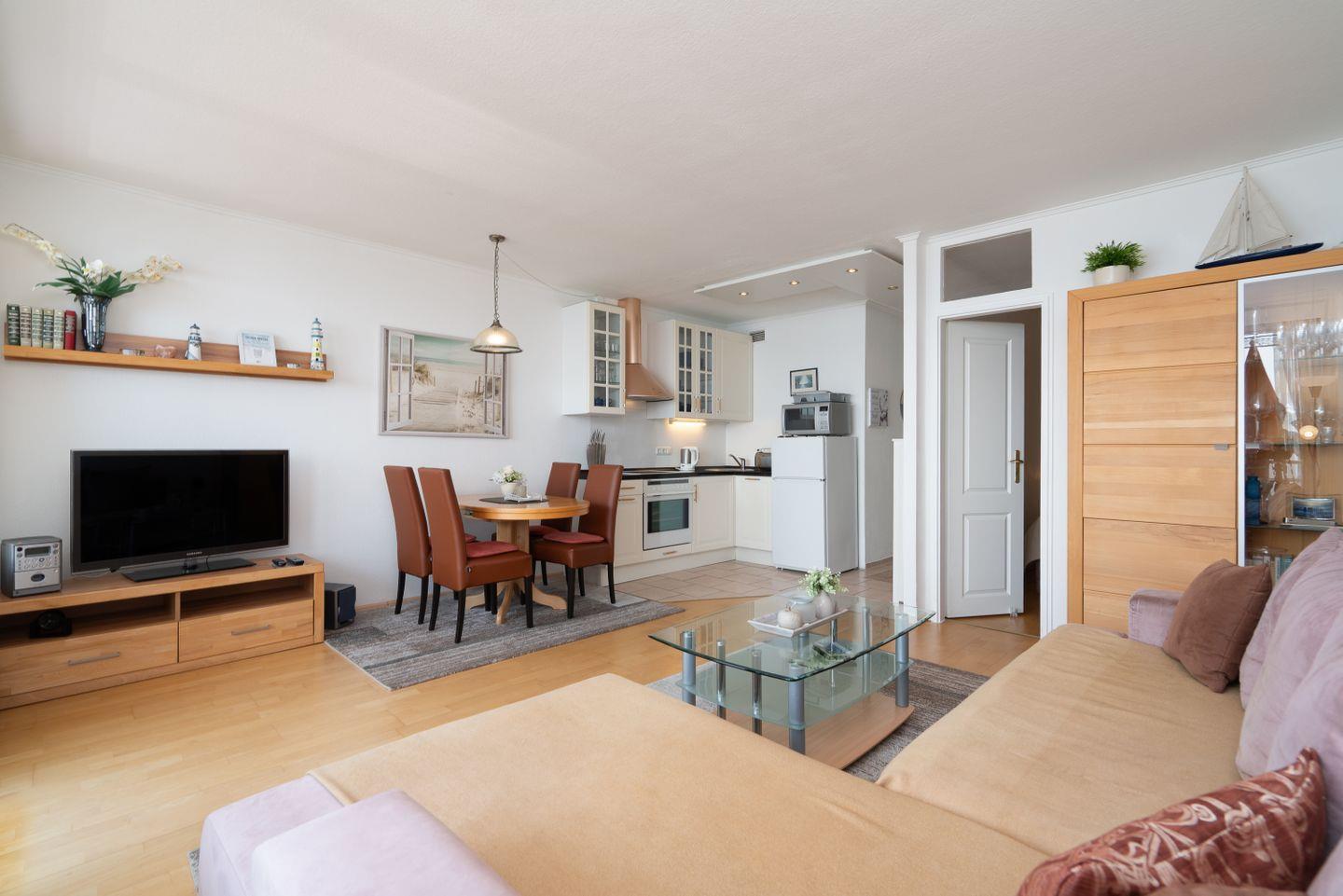 Die 2-Raum-Ferienwohnung Nr. 537 liegt in der 6. Etage und hat einen wunderschönen uneingeschränkten Panoramablick. Vom kombinierten Wohn- und Essbereich haben Sie Zugang zum Balkon. Die Küche ist mit Geschirrspüler, Cerankochfeld, Backofen und Kleingeräten ausgestattet und in den Wohn-/Essbereich integriert. Ein modernes Boxspringbett und ein großer Eckschrank erwarten Sie im Schlafzimmer. Im Wohnbereich steht zudem eine Schlafcouch. Zum Strand sind es nur wenige Fußschritte. WLAN inklusive.