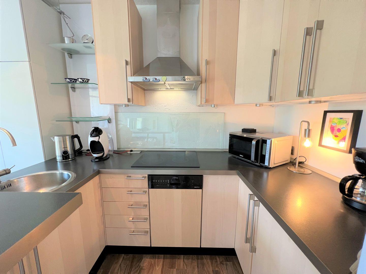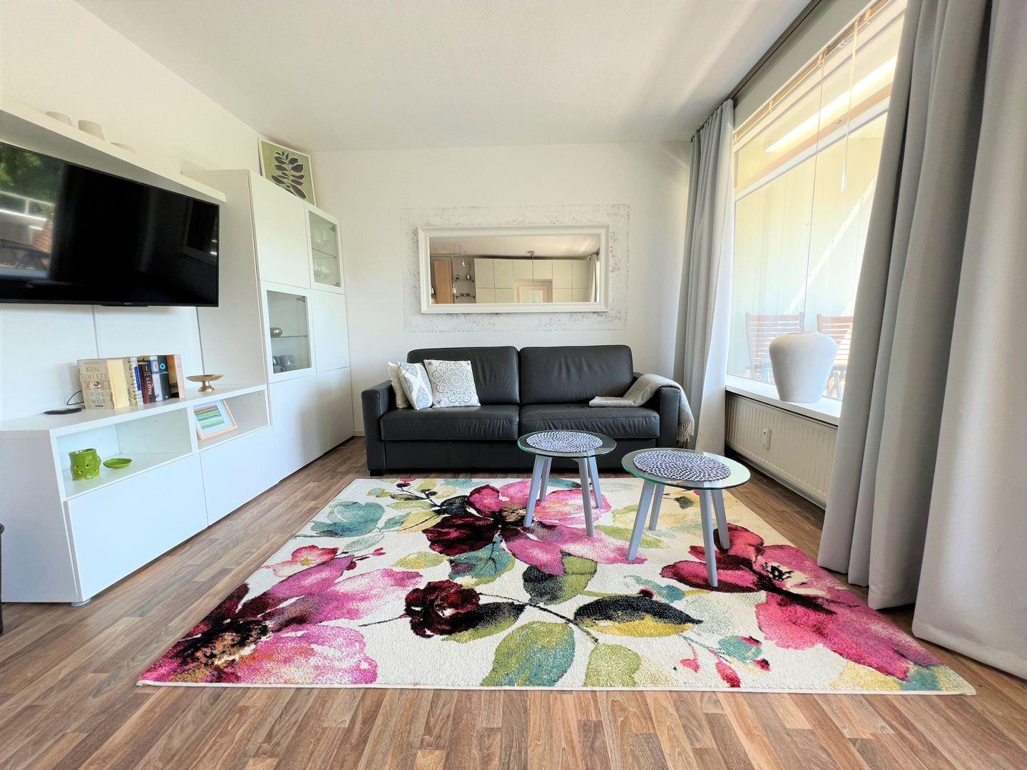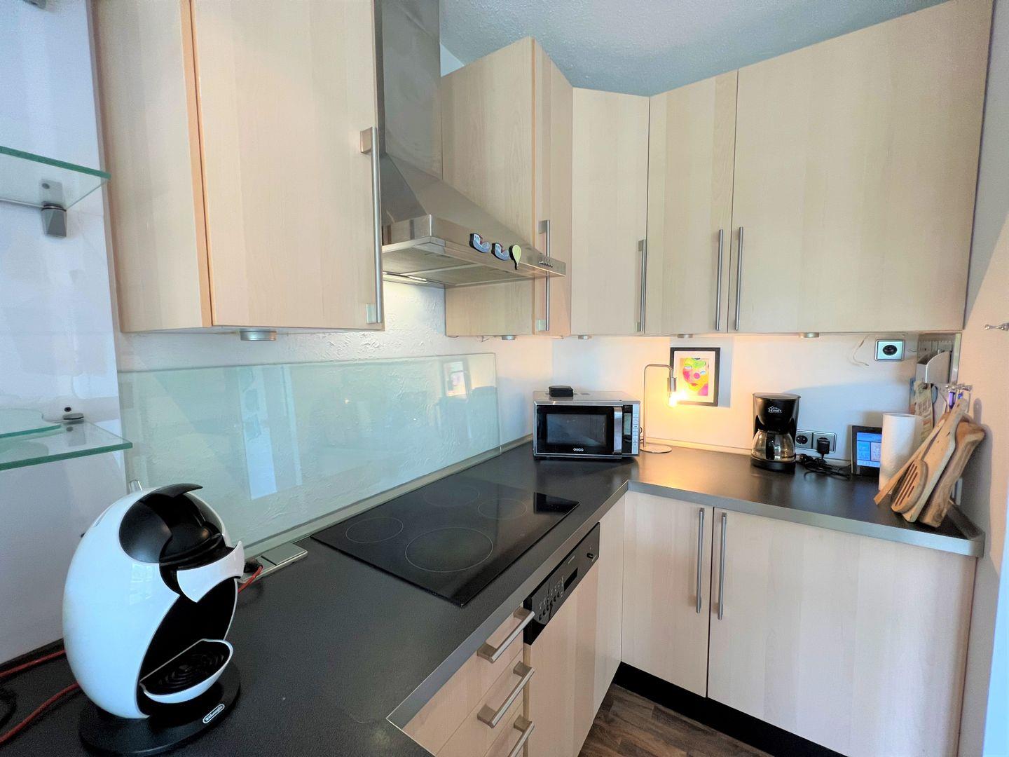Die helle und gemütliche 2-Raum-Ferienwohnung liegt in der 3. Etage mit Balkon. Von hier aus haben Sie einen schönen Blick ins Grüne. Die Küche, ausgestattet mit Spülmaschine und Herd, ist in den hellen Wohn- und Essbereich integriert. Das Schlafzimmer ist mit einem komfortablen Doppelbett ausgestattet. Das moderne Duschbad ist innenliegend. PKW-Stellplatz inklusive. Zum Strand sind es nur wenige Gehminuten.
