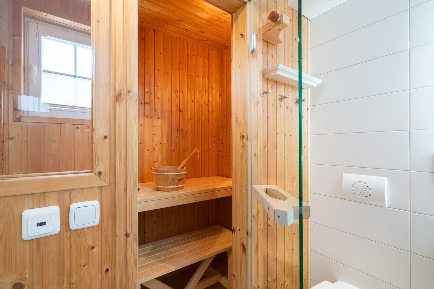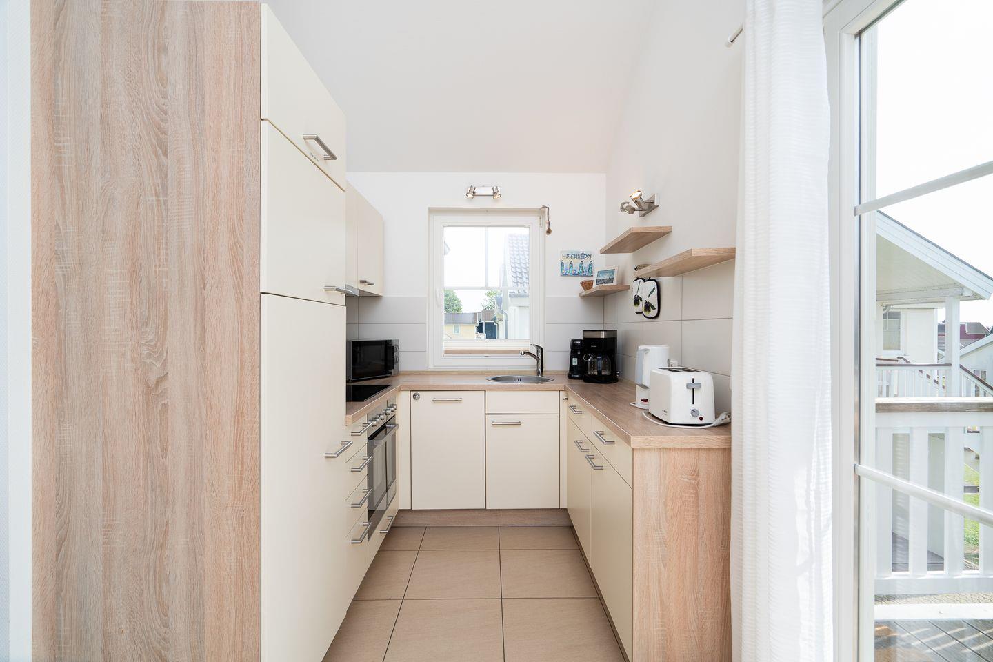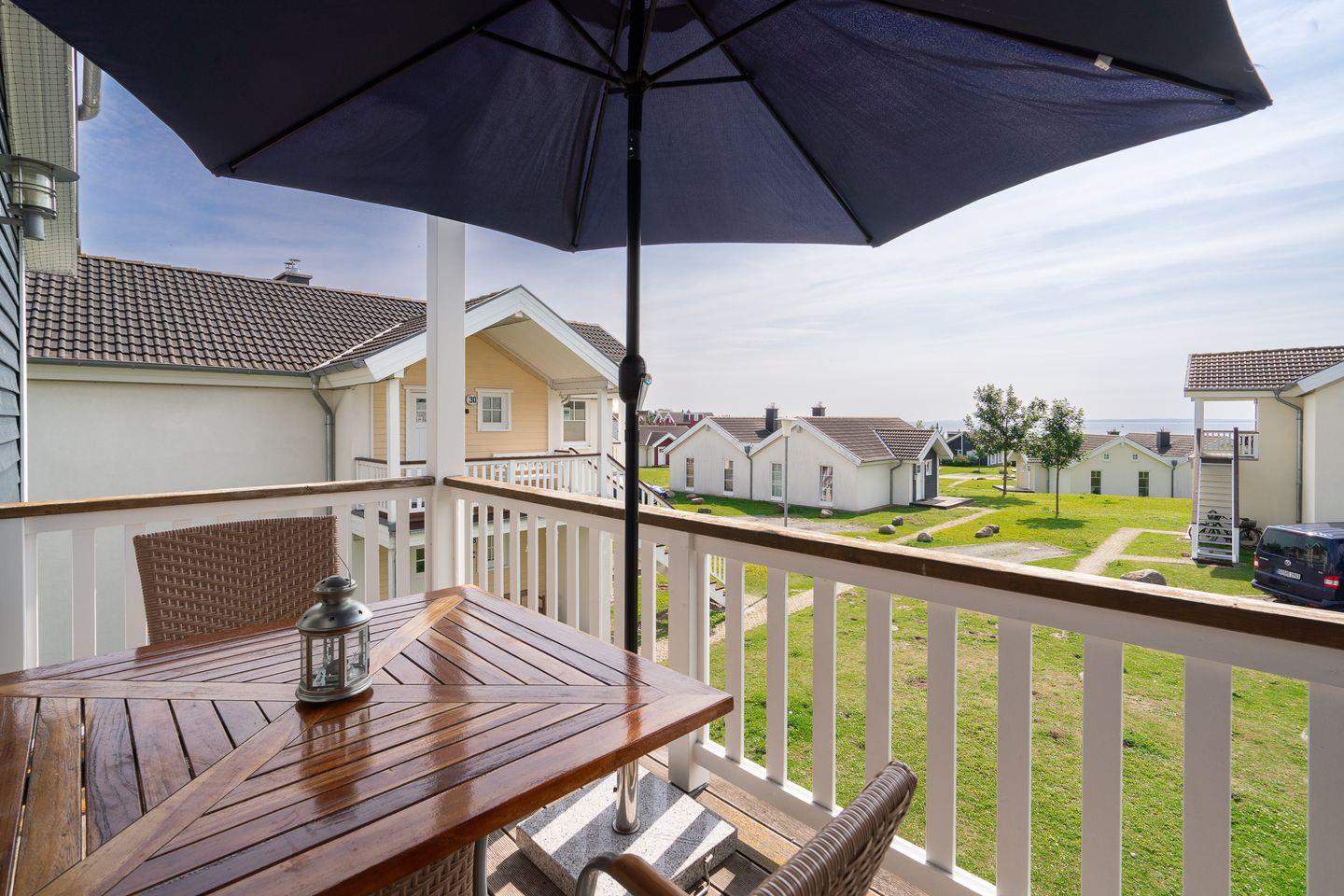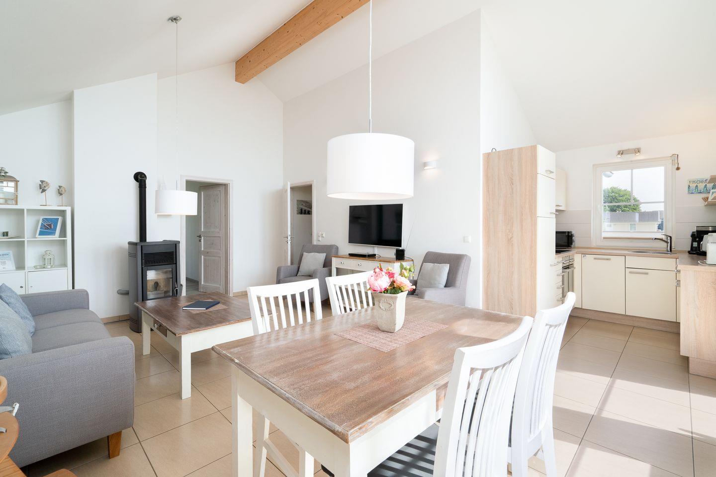 Die schöne Ferienwohnung „Brigantine“ Nr. 26 liegt in der 1. Etage eines Quattrobungalows, hat aber einen separaten Eingang. Vom geräumigen Wohn- und Essraum mit Pelletofen haben Sie Zugang zum Balkon. Die offene Küche ist mit Spülmaschine, Backofen und Herd ausgestattet, zudem steht eine Waschmaschine zur Verfügung. Der erste Schlafraum hat ein Doppelbett, im zweiten stehen zwei Einzelbetten. Das Bad ist mit Badewanne und Sauna ausgestattet. WLAN ist inklusive.