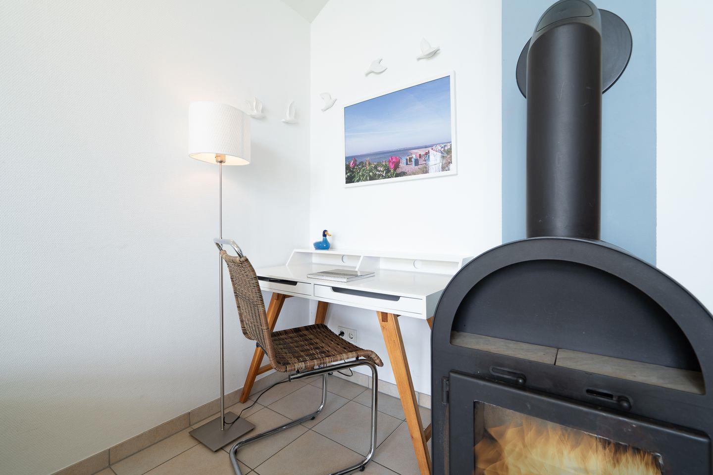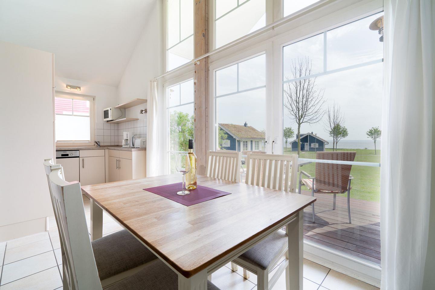 Auf 70 qm stehen Ihnen auf einer Ebene zwei Schlafräume und ein geräumiger Wohn- und Essraum mit Kamin und Zugang zur Terrasse mit Meerblick zur Verfügung. Die zum Essbereich hin offene, moderne Küche ist mit Geschirrspülmaschine, Herd und Mikrowelle voll ausgestattet. Der Kaminofen sorgt für gemütliche Stunden mit Freunden und Familie. Im ersten Schlafraum steht ein Doppelbett, im zweiten Schlafraum zwei Einzelbetten. Im Bad finden Sie die Sauna, Waschmaschine, sowie eine Dusche. Der Komfort einer eigenen Sauna wird sehr von unseren Wintergästen geschätzt.