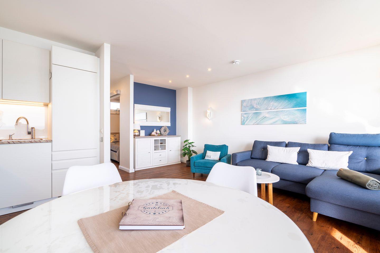 Die modern und geschmackvoll eingerichtete Ferienwohnung Nr. 212 ist ideal für Ihren Familienurlaub. Vom Balkon mit Strandkorb haben Sie einen schönen Meerblick. Die mit Spülmaschine, Backofen und Herd ausgestattete Küche ist in den Wohn-/Essbereich integriert. Der Schlafraum mit einem gemütlichen Doppelbett hat ein zusätzliches TV-Gerät. Der Wohn-/Essbereich verfügt über ein Schlafsofa. Das Bad mit bodentiefer Dusche ist innenliegend. Zum Strand sind es nur wenige Fußschritte. WLAN inklusive.