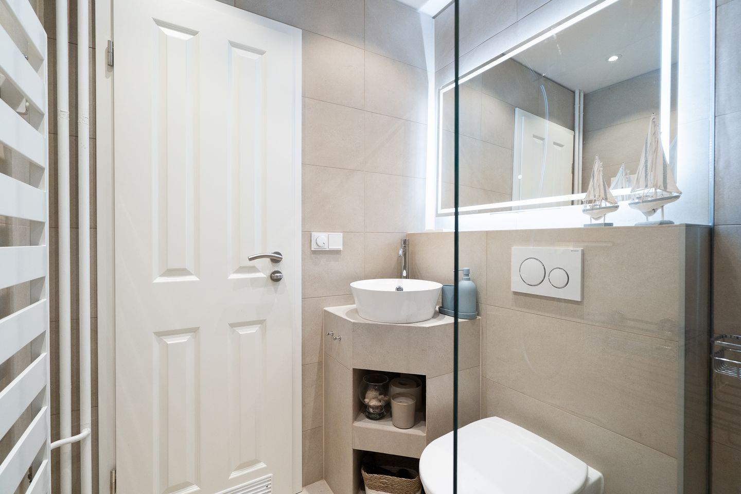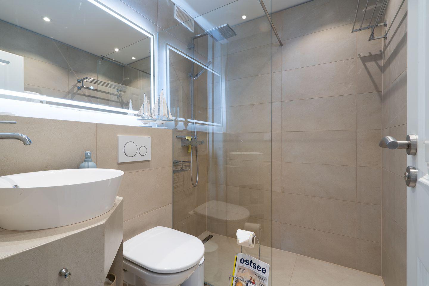 Das geschmackvolle Badezimmer verfügt über eine Walk-in Dusche, einen beleuchteten Spiegel sowie einen beheizbaren Handtuchhalter.
