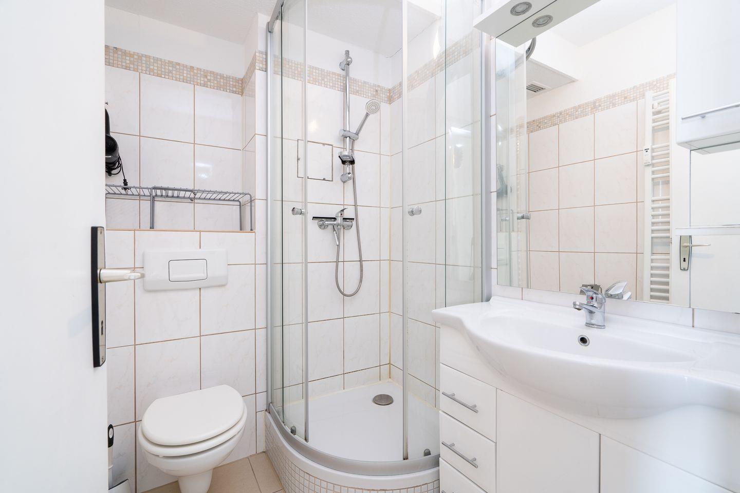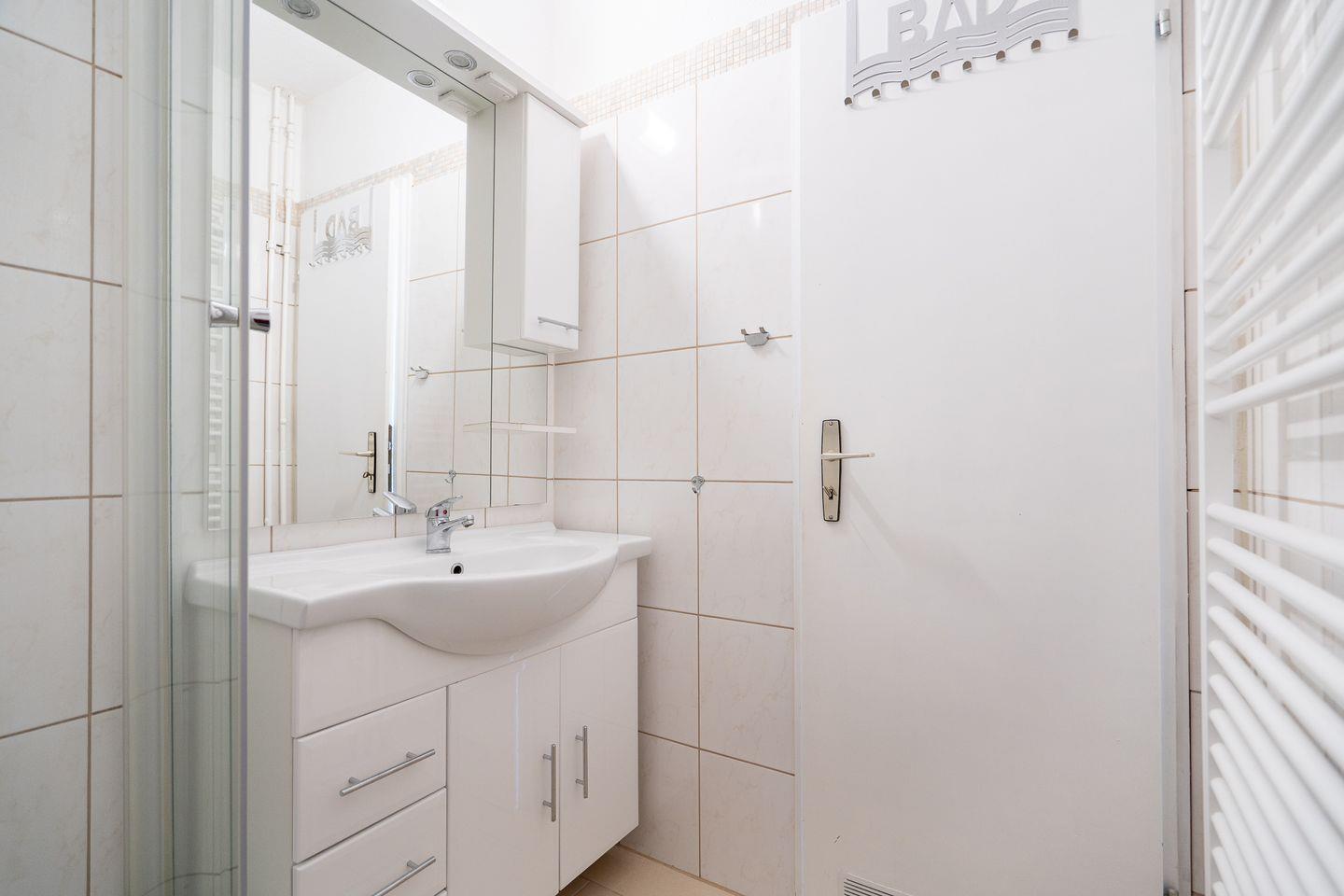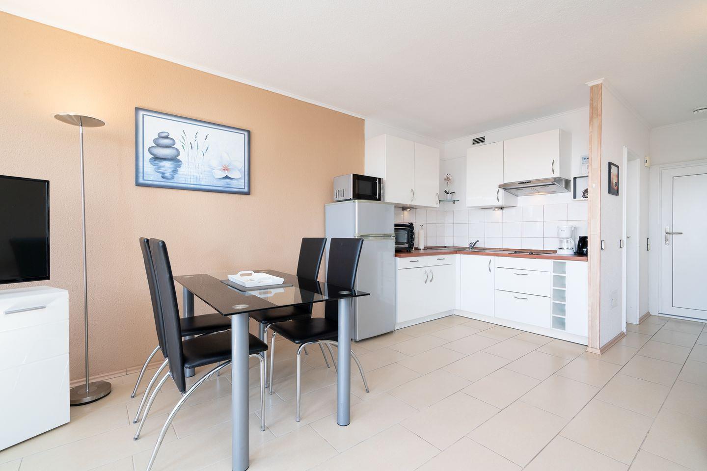 Die helle 1-Raum-Ferienwohnung liegt in der 4. Etage, vom Balkon blicken Sie über die Anlage hinweg in die Lübecker Bucht. Die Küche mit Backofen, Herd und Mikrowelle ist in den kombinierten Wohn-/Essbereich integriert. Der Schlafbereich mit Doppelbett lässt sich durch ein Schiebeelement vom Wohnbereich abtrennen. Hier steht zudem ein Schlafsofa, so dass die Wohnung für 4 Personen geeignet ist. Das hell geflieste Duschbad ist innenliegend. Zum Strand sind es wenige Fußschritte. WLAN inklusive.