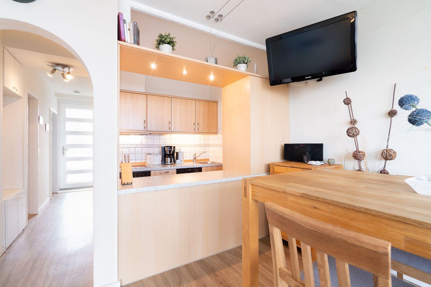 Herzlich Willkommen in der 3-Raum-Ferienwohnung Nr. 241! Die Wohnung befindet sich in der 2. Reihe der Terrassenhäuser. Über die 1. Reihe hinweg genießen Sie von der 3. Etage aus einen tollen Blick über die Lübecker Bucht. Vom Wohn-/Essbereich haben Sie Zugang zum Balkon. Die Küche mit Spülmaschine, Backofen und Herd ist mit einer Durchreiche zum Essbereich offen. Im 1. Schlafraum steht ein Doppelbett, im 2. ein Etagenbett. Das Duschbad ist innenliegend. Zum Strand sind es nur wenige Gehminuten.