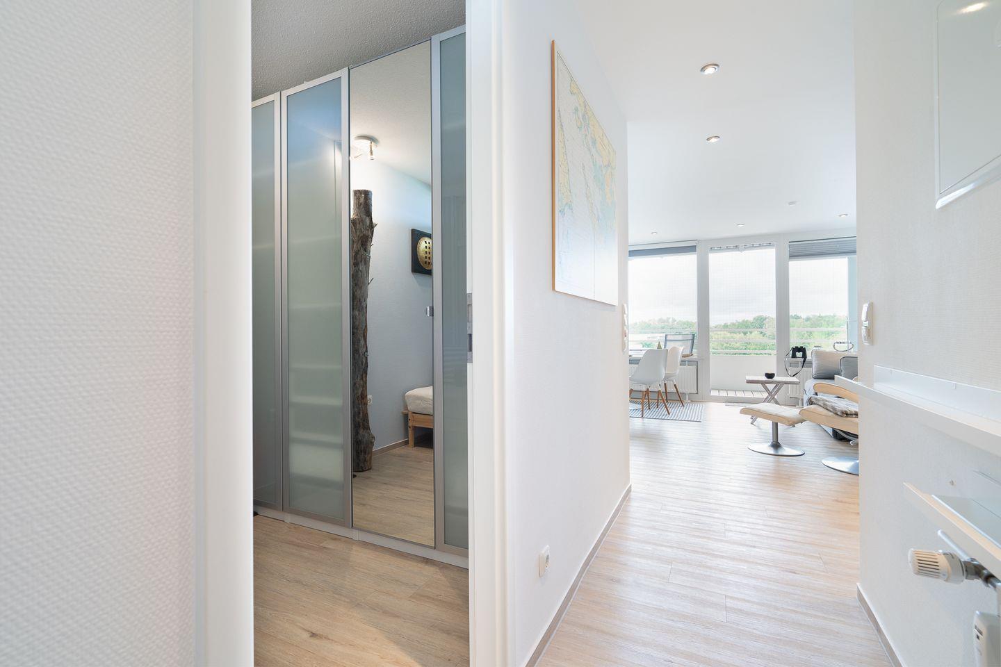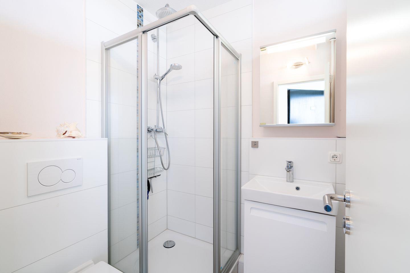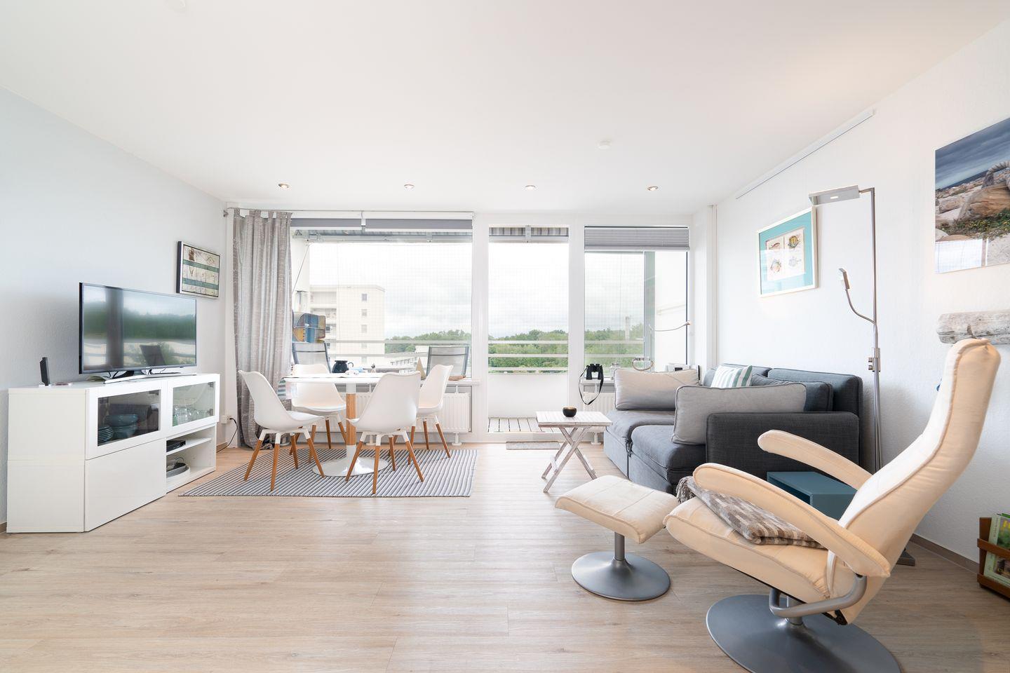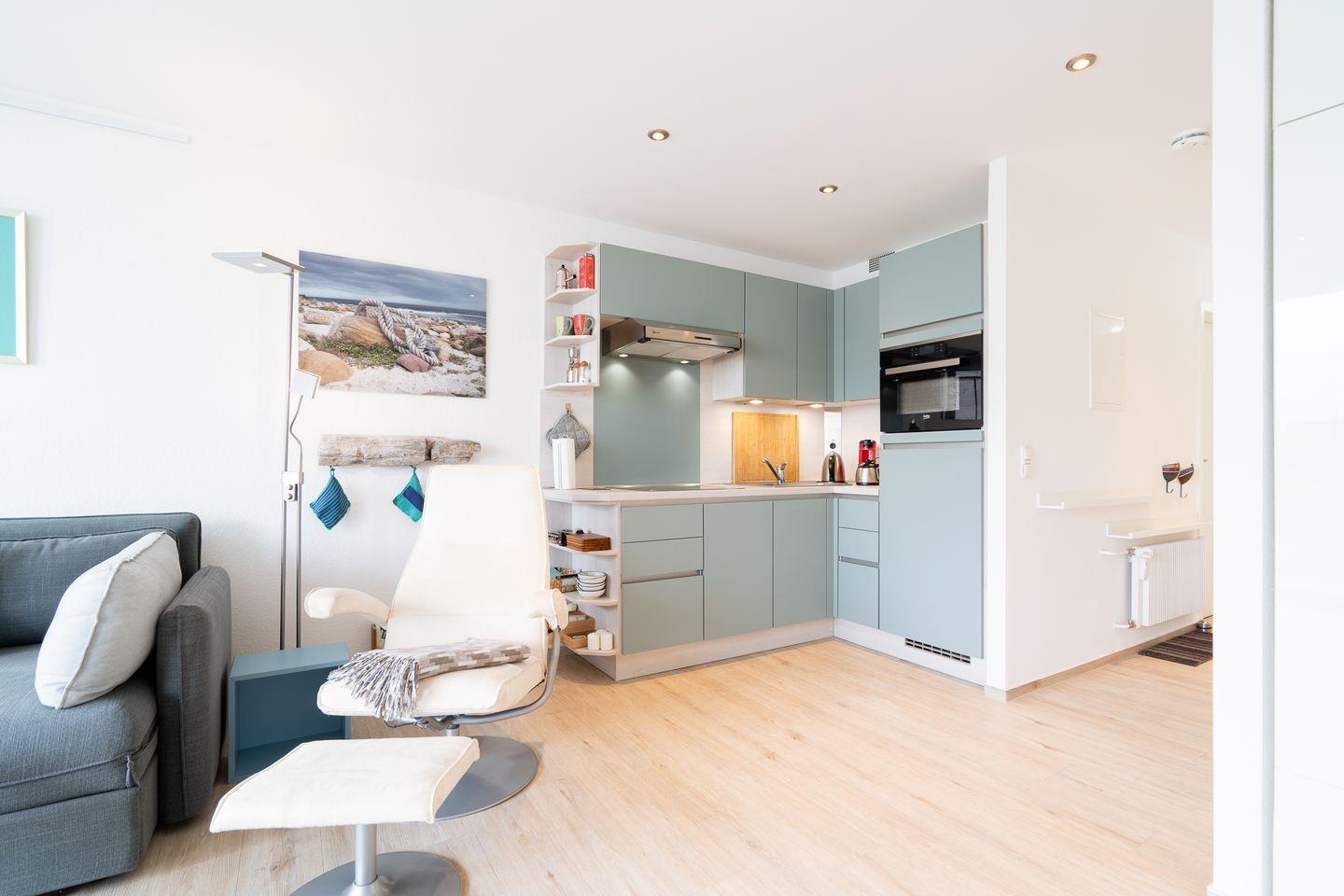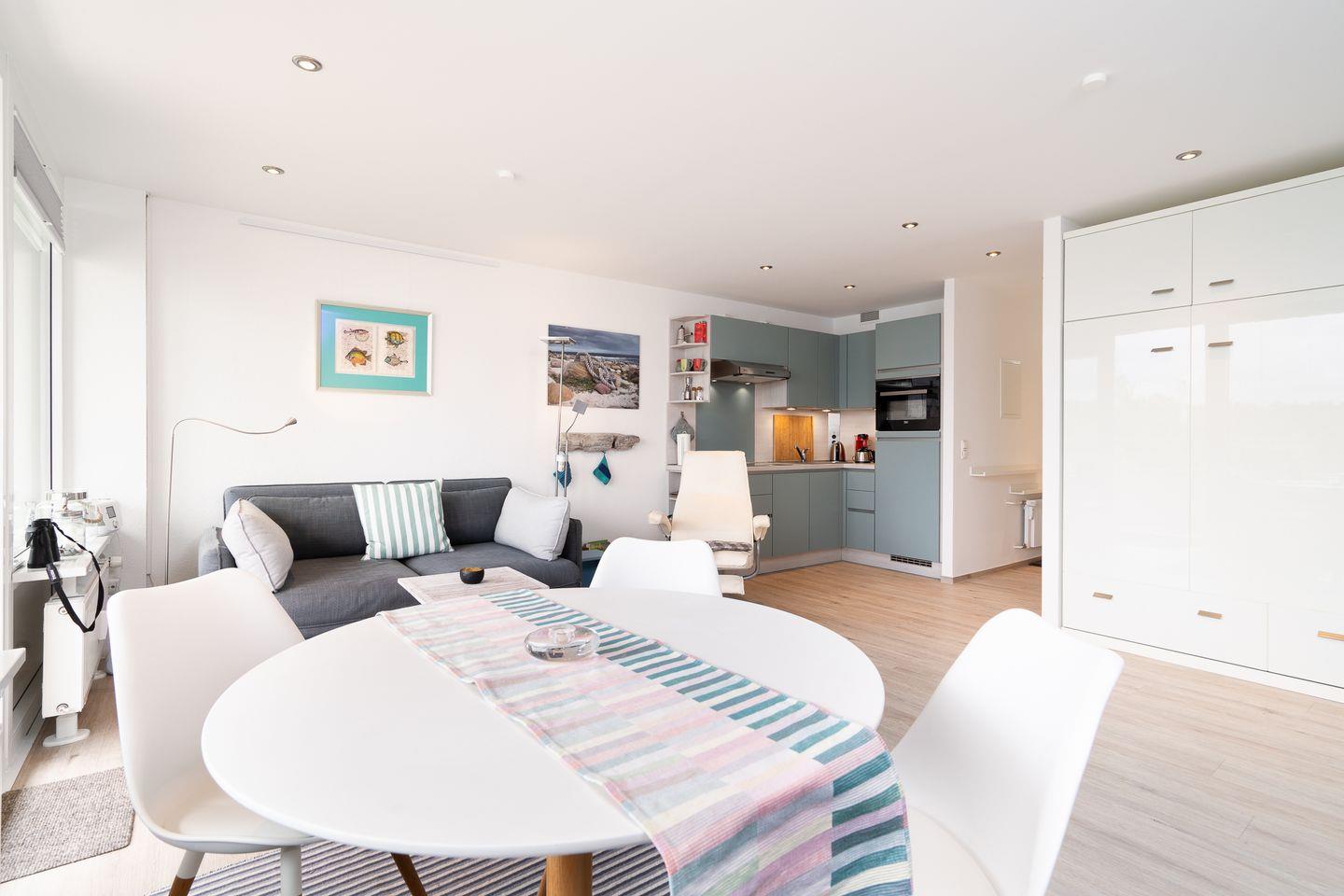 Die Wohnung mit Balkon befindet sich in der 4. Etage eines Hochhauses und hat seitlichen Meerblick zwischen die anderen Häuser hindurch. Die moderne Küche ist mit Spülmaschine, Backofen und Herd ausgestattet und ist in den kombinierten Wohn- und Essbereich integriert. Im Wohnbereich befinden sich ein Schrankbett, sowie ein Schlafsofa. Im separaten Schlafraum mit Oberlicht steht ein Einzelbett. Das helle Bad verfügt über eine Dusche und ebenfalls ein Oberlicht. Zum Strand sind es nur wenige Fußschritte. PKW-Stellplatz inklusive.