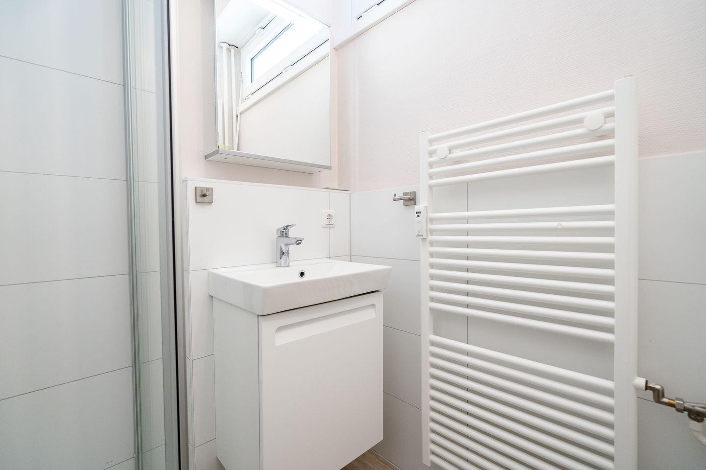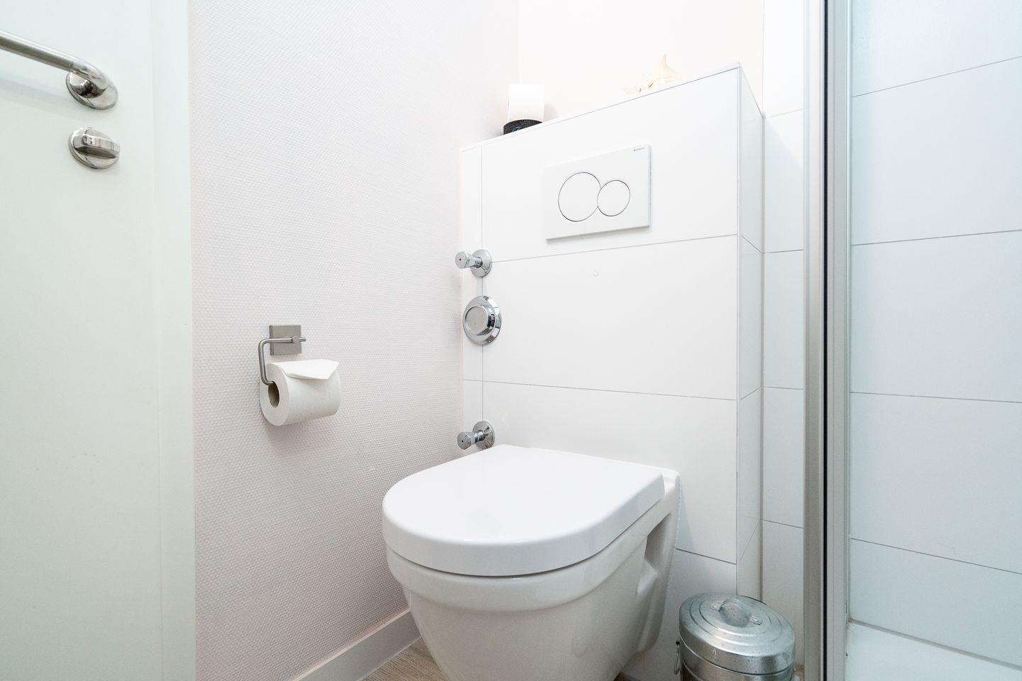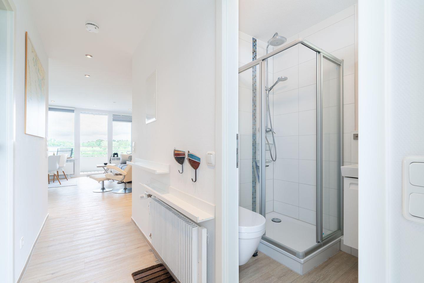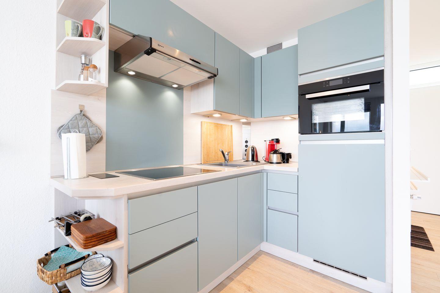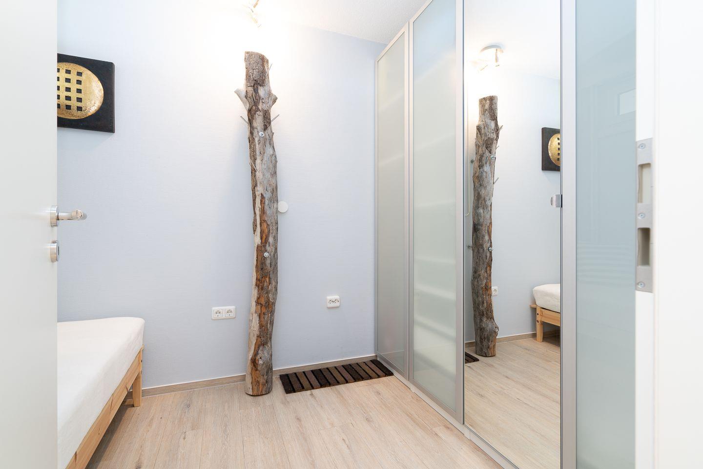 Die Wohnung mit Balkon befindet sich in der 4. Etage eines Hochhauses und hat seitlichen Meerblick zwischen die anderen Häuser hindurch. Die moderne Küche ist mit Spülmaschine, Backofen und Herd ausgestattet und ist in den kombinierten Wohn- und Essbereich integriert. Im Wohnbereich befinden sich ein Schrankbett, sowie ein Schlafsofa. Im separaten Schlafraum mit Oberlicht steht ein Einzelbett. Das helle Bad verfügt über eine Dusche und ebenfalls ein Oberlicht. Zum Strand sind es nur wenige Fußschritte. PKW-Stellplatz inklusive.
