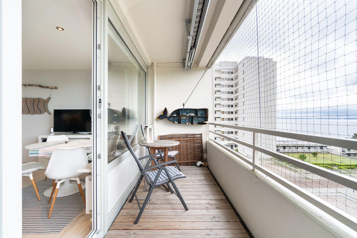 Die Wohnung mit Balkon befindet sich in der 4. Etage eines Hochhauses und hat seitlichen Meerblick. Die moderne Küche ist mit Spülmaschine, Backofen und Herd ausgestattet und in den kombinierten Wohn- und Essbereich integriert. Im Wohnbereich befinden sich ein Schrankbett, sowie ein Schlafsofa. Im separaten Schlafraum mit Oberlicht steht ein Einzelbett. Das helle Bad verfügt über eine Dusche und ebenfalls ein Oberlicht. Zum Strand sind es nur wenige Fußschritte.
