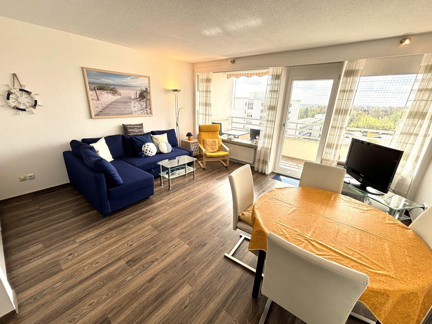 Die schöne 2-Raum-Ferienwohnung Nr. 426 liegt in der 7. Etage eines Hochhauses und ist für 2 bis 4 Personen geeignet. Vom Balkon aus haben Sie über die Häuser der Anlage hinweg Sicht auf die Ostsee. Die Küche ist mit Backofen und Herd ausgestattet und in den kombinierten Wohn- und Essbereich integriert. Hier steht auch ein bequemes Schlafsofa. Im Schlafraum stehen zwei Einzelbetten. mDas hell geflieste Bad hat eine Dusche und ein Oberlicht zum Lüften. Zum Strand sind es nur wenige Fußschritte.