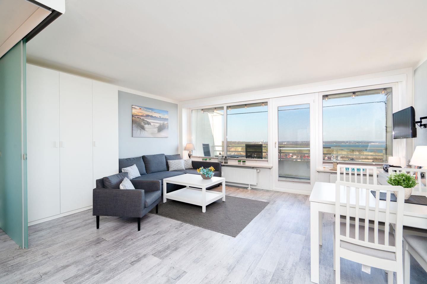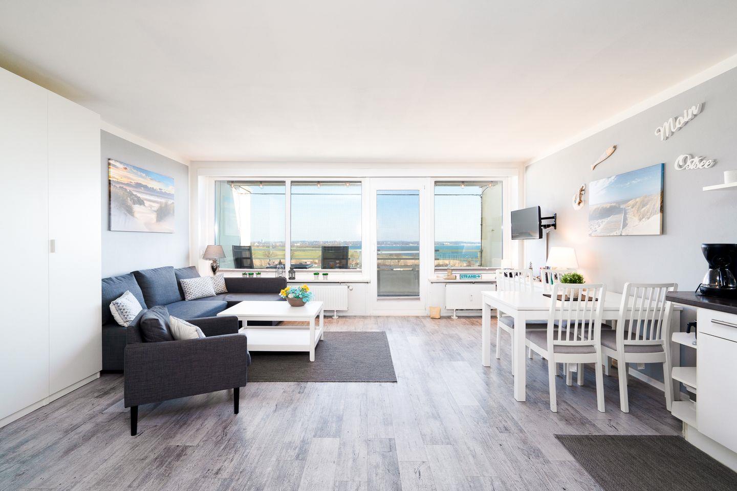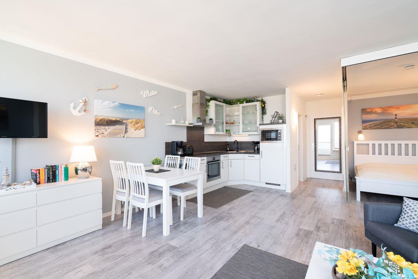 Diese schöne 2-Raum Ferienwohnung ist ein wunderbares Feriendomizil für einen entspannten Strandurlaub. Vom Balkon haben Sie einen schönen Blick auf die Ostsee. Die moderne Küche ist mit Spülmaschine, Backofen und Herd ausgestattet und in den kombinierten Wohn-/Essbereich integriert. Der Schlafraum mit Doppelbett (2x 90 cm x 200 cm) lässt sich durch verschiebare Glas-Elemente vom Wohnraum trennen. Im Wohnraum steht zudem ein bequemes Schlafsofa (140 x 200 cm), so dass die Wohnung mit bis zu vier Personen belegt werden kann. Das moderne Duschbad ist innenliegend. Zum Strand sind es nur wenige Fußschritte. PKW-Stellplatz inklusive.