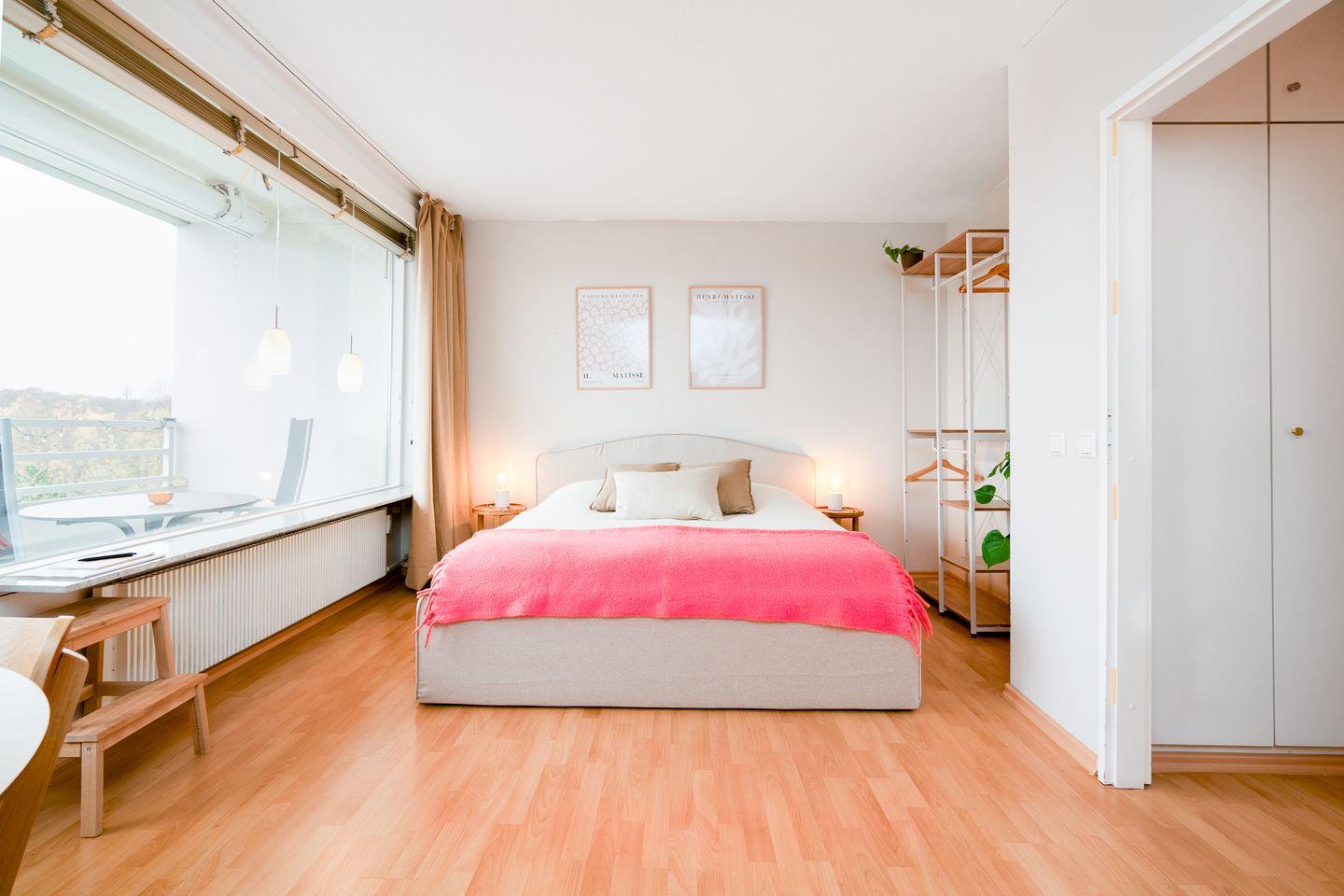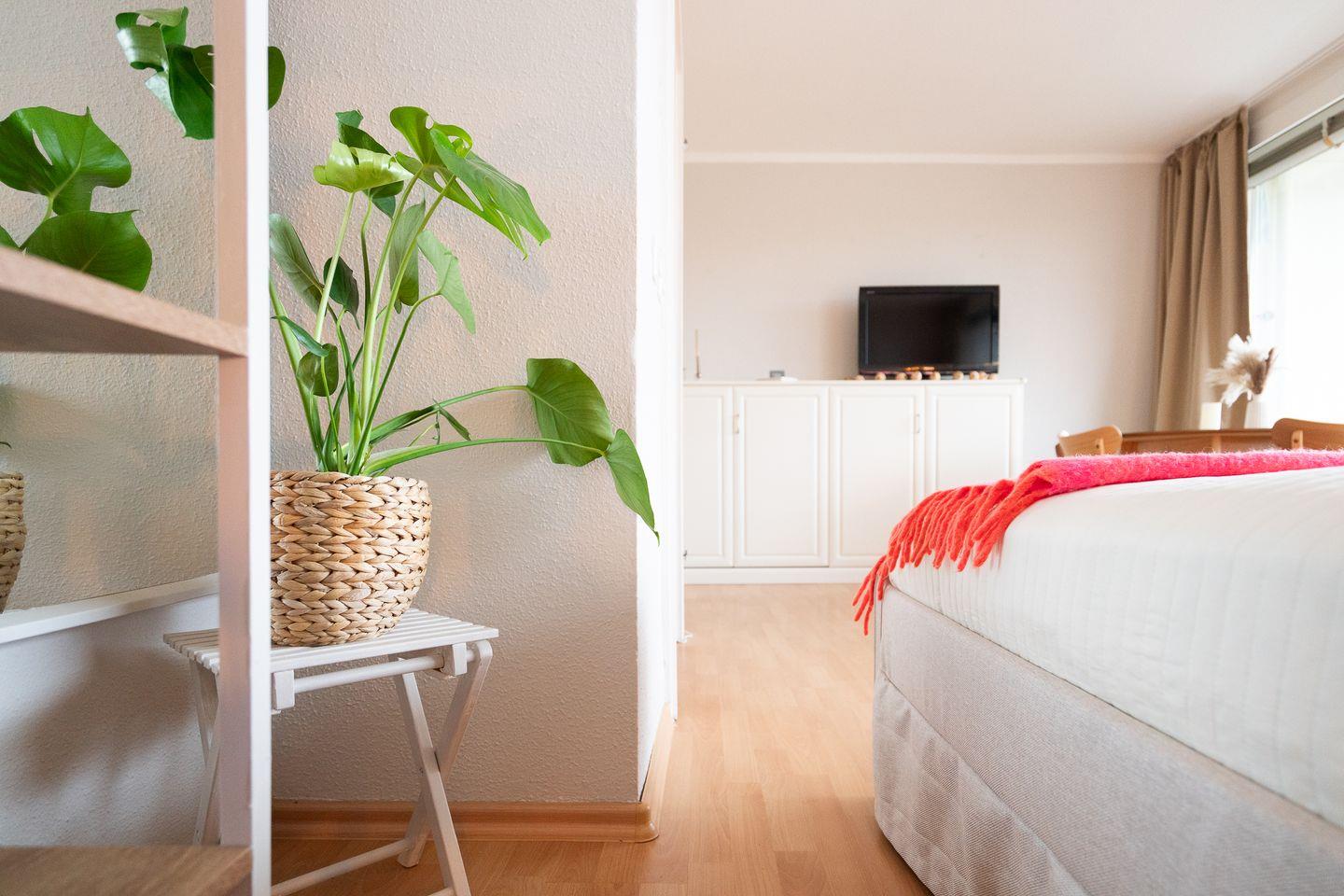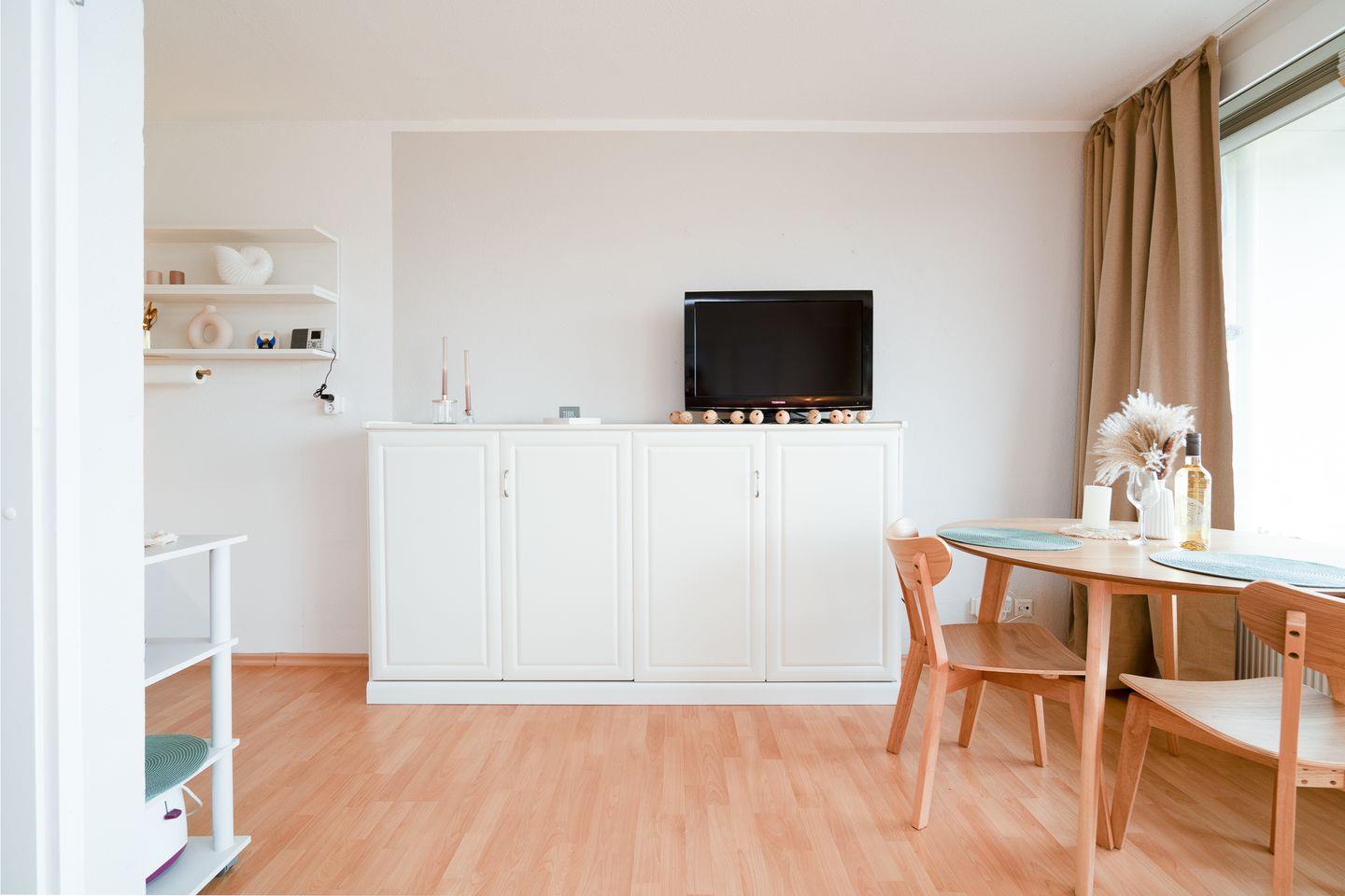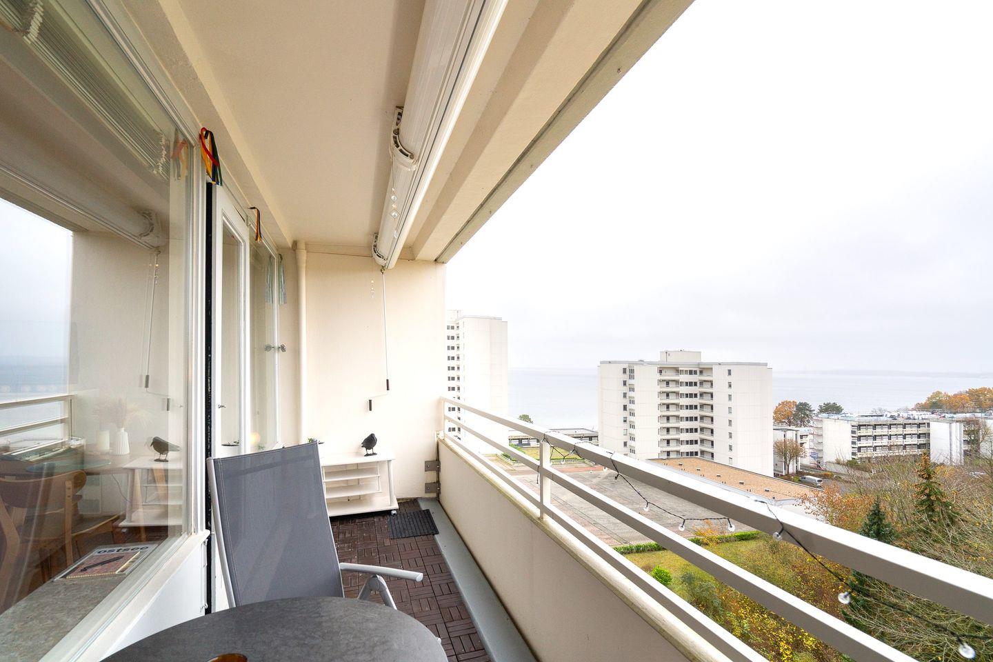 Das liebevoll eingerichtete 1-Raum-Appartement in der 7. Etage ist für 2-3 Personen geeignet und hat einen Balkon mit seitlichem Ostseeblick. Vom kombinierten Wohn- und Essbereich mit offener Küche haben Sie Zugang zum Balkon mit Blick über die Lübecker Bucht. Die kleine, aber feine Küche ist mit Backofen und Herd ausgestattet. Im offenen Schlafbereich befindet sich ein gemütliches Doppelbett (180 x 200 cm). Zudem steht Ihnen ein elegantes Schrankbett (90 x 200 cm) zur Verfügung.