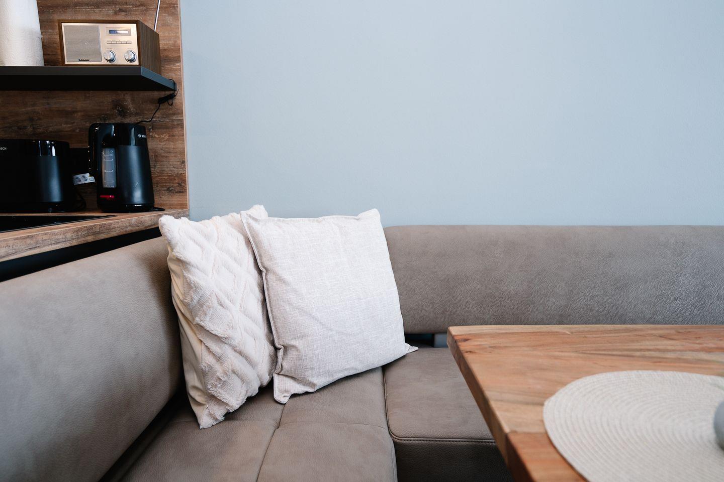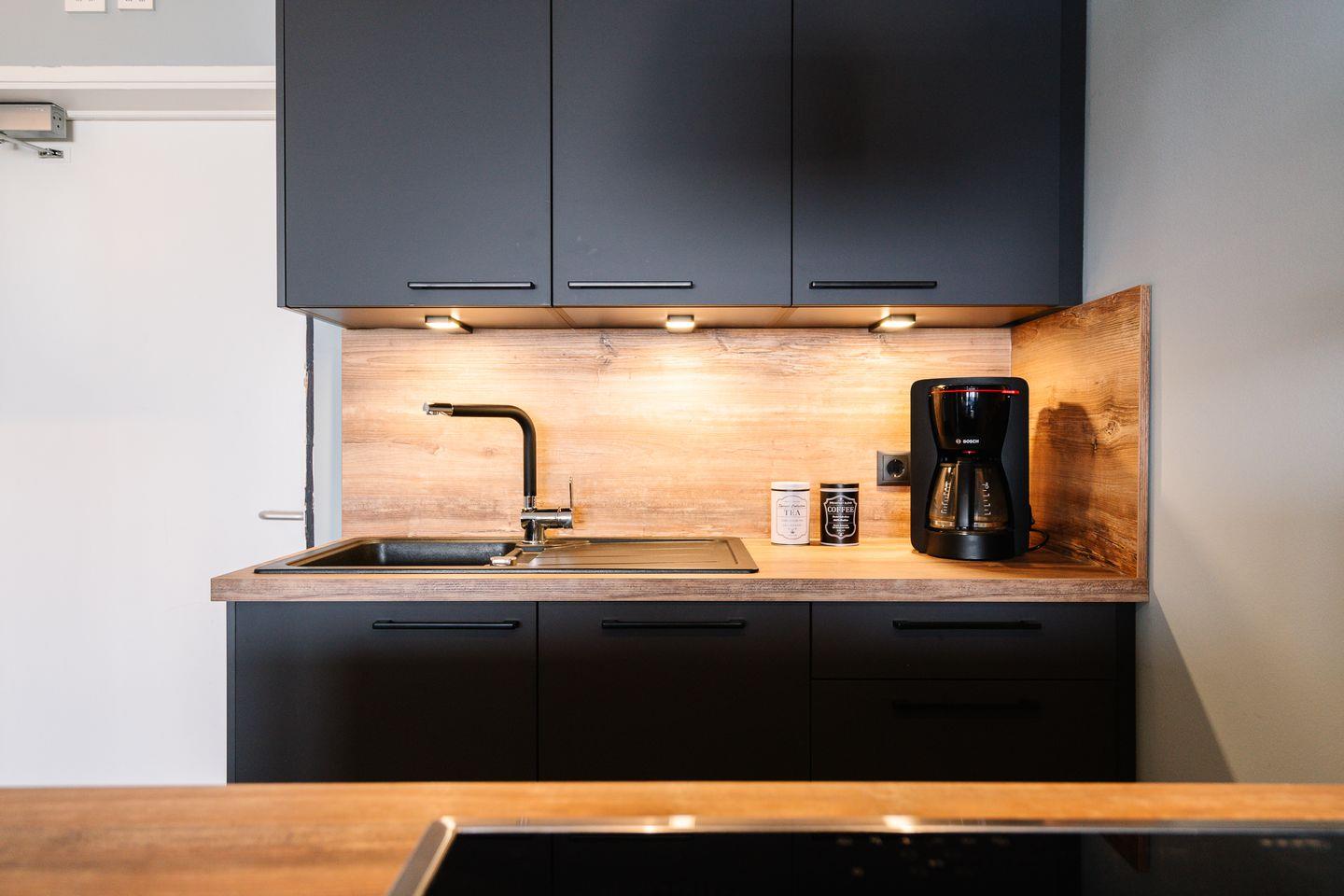 Die voll ausgestattete Küche überzeugt mit allem was man zur Selbstverpflegung braucht, wie Kühlschrank mit separatem Gefrierfach, Spülmaschine, Cerankochfeld, Backofen, Kaffeemaschine, Toaster und Wasserkocher.