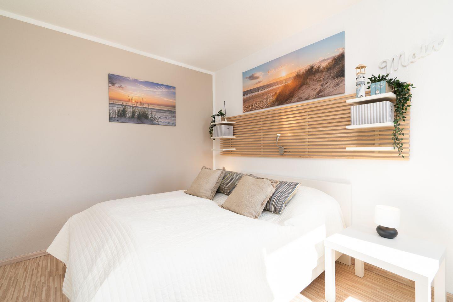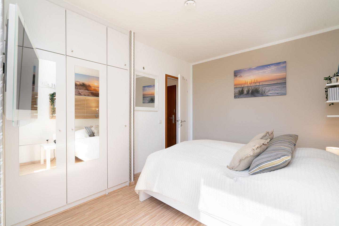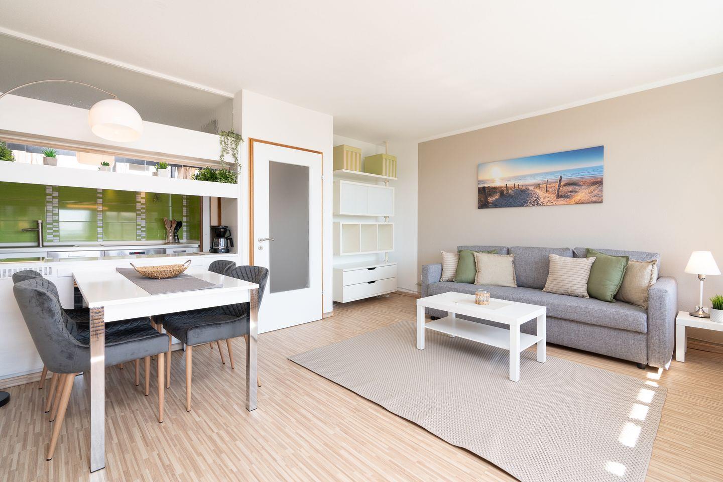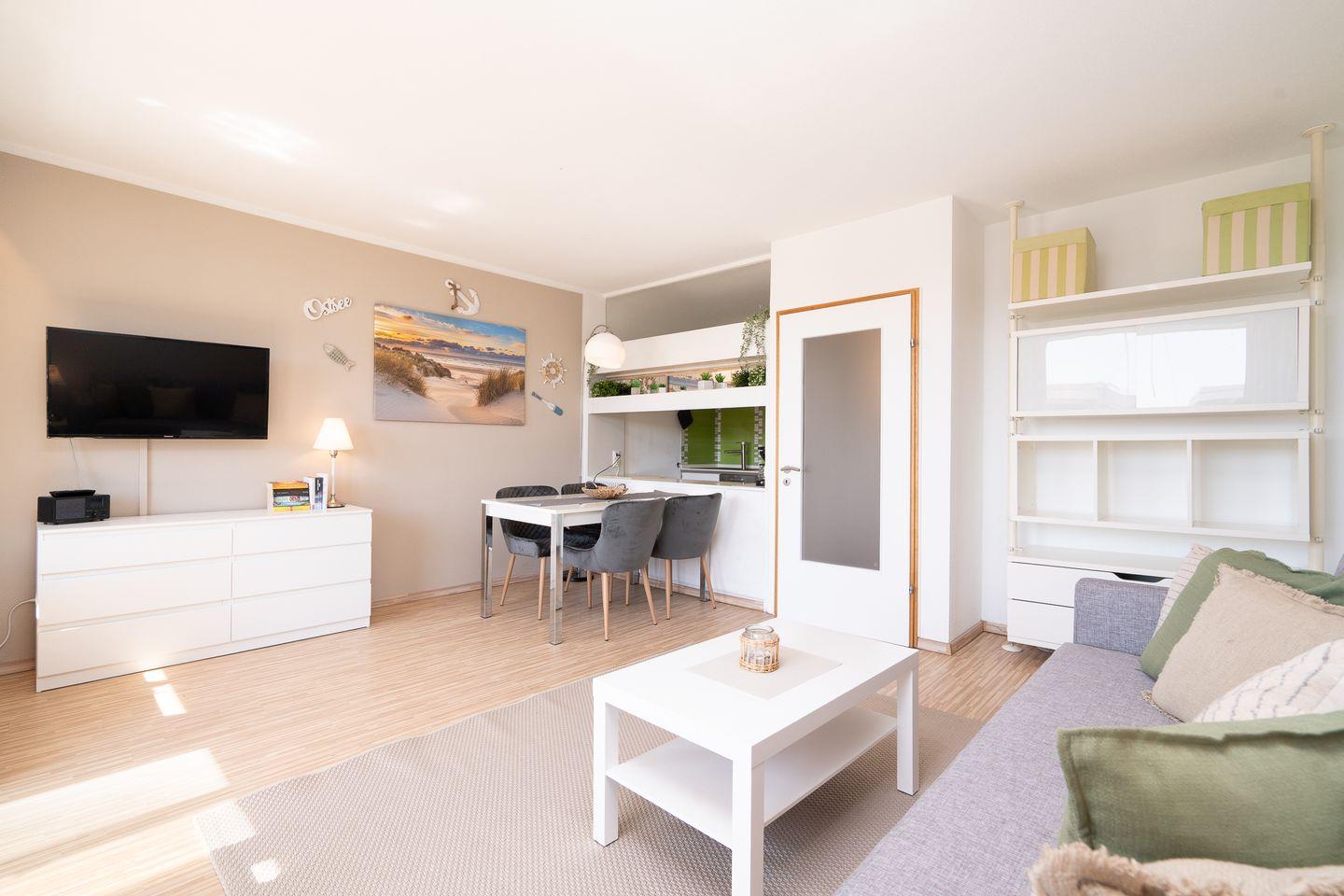 Die Unterkunft ist modern und geschmackvoll ausgestattet. Ein französisches Doppelbett (160 x 200 cm, zwei Matratzen) im Schlafzimmer mit Fenster und zusätzlichem Fernseher bietet erholsamen Schlaf, während das geräumige Wohnzimmer mit einem Schlafsofa (160 cm x 200 cm) zum Entspannen einlädt. Der Fernseher mit einer Bildschirmgröße von 35 bis 44 Zoll, Radio und WLAN sorgen für gute Unterhaltung. Die offene Küche ist mit allen erforderlichen Geräten und Utensilien ausgestattet, darunter Cerankochfeld, Backofen, Kühlschrank mit Gefrierfach, Spülmaschine, Wasserkocher, Toaster und Kaffeemaschine. Der Essbereich ist direkt angrenzend eingerichtet und ermöglicht Mahlzeiten in gemütlicher Atmosphäre. Das Badezimmer verfügt über eine Badewanne und ist innenliegend. Zur weiteren Ausstattung zählt ein Balkon, auf dem Sie die frische Meeresluft genießen können. Balkonmöbel und Sonnenschutz sind vorhanden. Ein PKW-Stellplatz ist inklusive. Zum Strand sind es nur wenige Schritte.