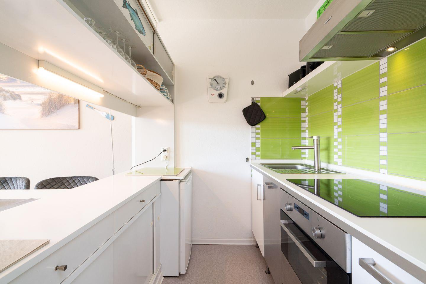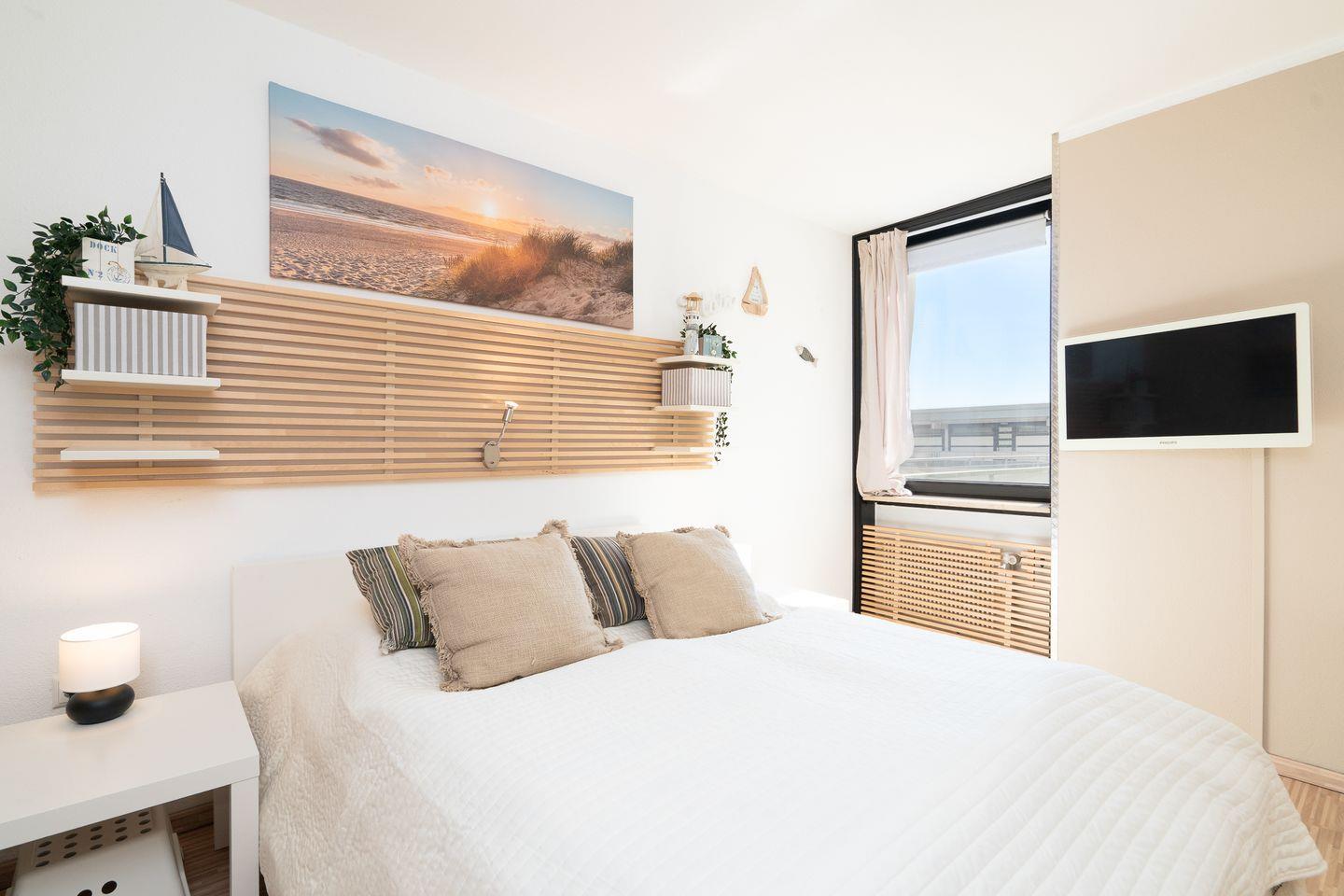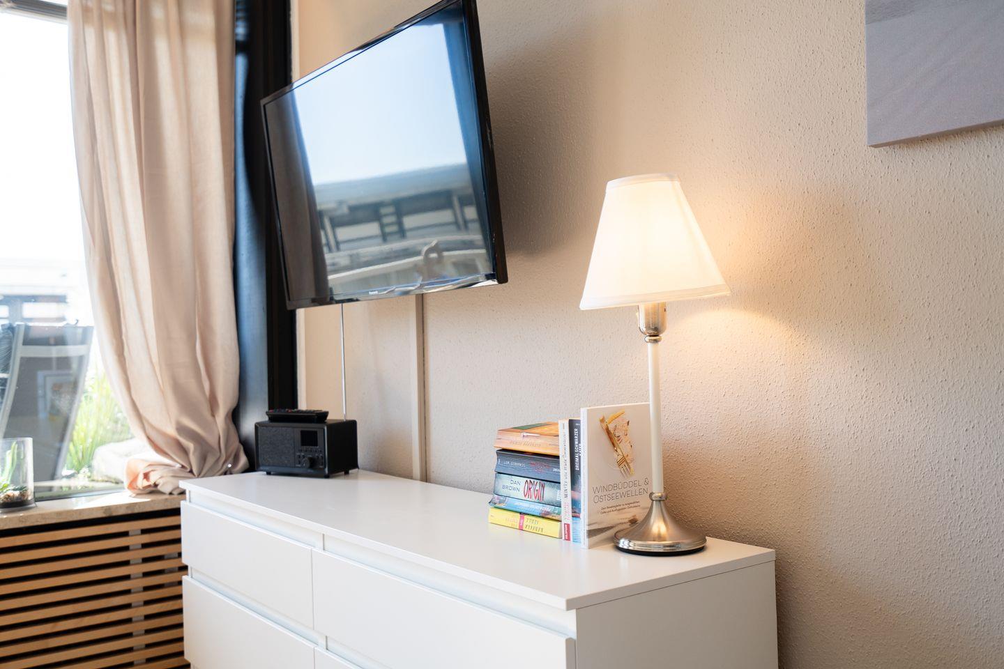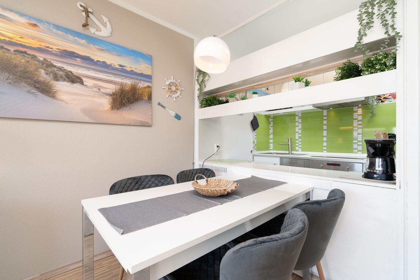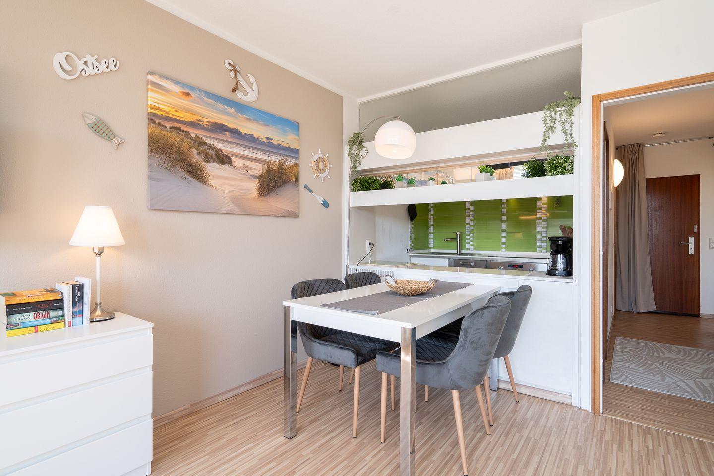 Die Unterkunft ist modern und geschmackvoll ausgestattet. Ein französisches Doppelbett (160 x 200 cm, zwei Matratzen) im Schlafzimmer mit Fenster und zusätzlichem Fernseher bietet erholsamen Schlaf, während das geräumige Wohnzimmer mit einem Schlafsofa (160 cm x 200 cm) zum Entspannen einlädt. Der Fernseher mit einer Bildschirmgröße von 35 bis 44 Zoll, Radio und WLAN sorgen für gute Unterhaltung. Die offene Küche ist mit allen erforderlichen Geräten und Utensilien ausgestattet, darunter Cerankochfeld, Backofen, Kühlschrank mit Gefrierfach, Spülmaschine, Wasserkocher, Toaster und Kaffeemaschine. Der Essbereich ist direkt angrenzend eingerichtet und ermöglicht Mahlzeiten in gemütlicher Atmosphäre. Das Badezimmer verfügt über eine Badewanne und ist innenliegend. Zur weiteren Ausstattung zählt ein Balkon, auf dem Sie die frische Meeresluft genießen können. Balkonmöbel und Sonnenschutz sind vorhanden. Ein PKW-Stellplatz ist inklusive. Zum Strand sind es nur wenige Schritte.
