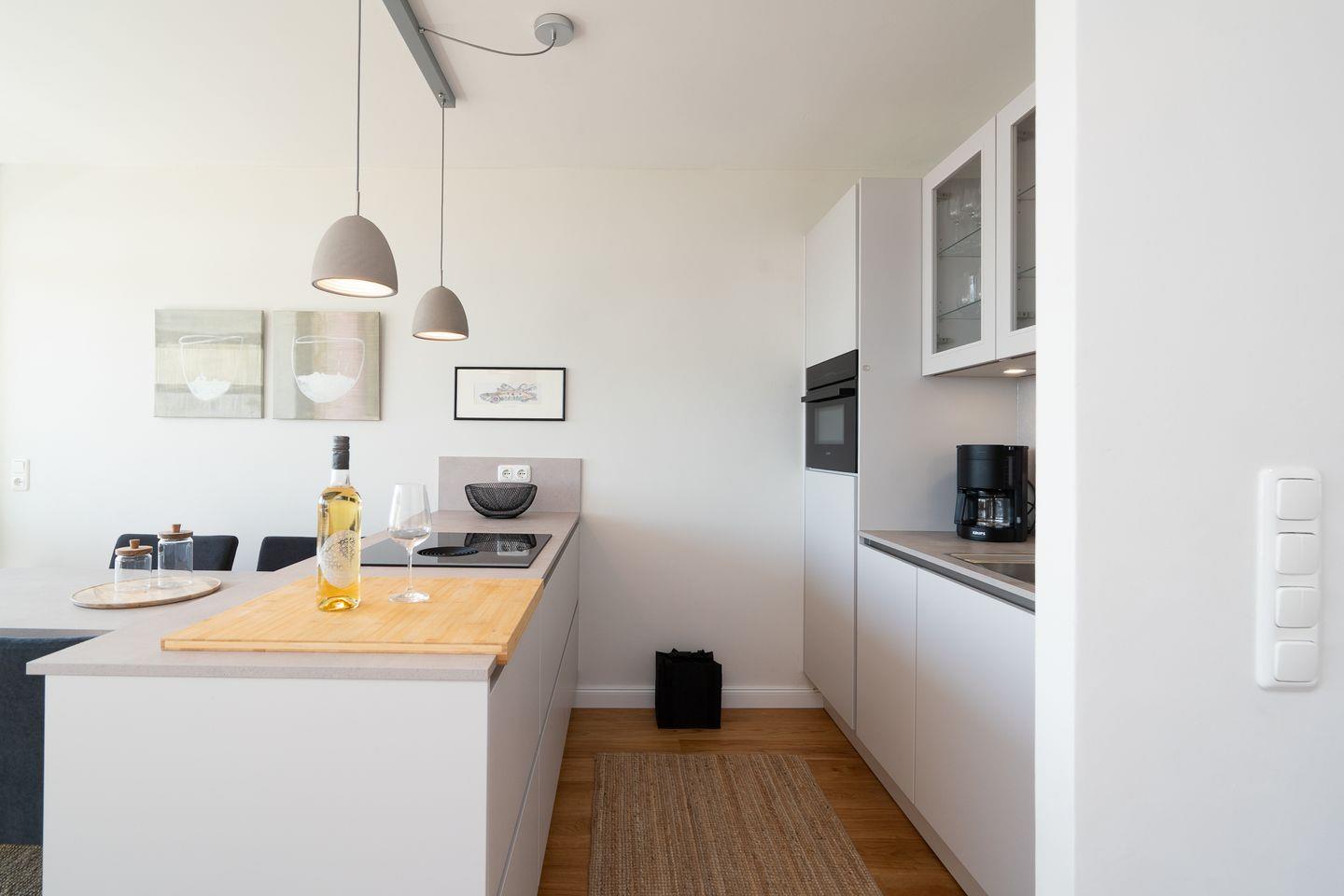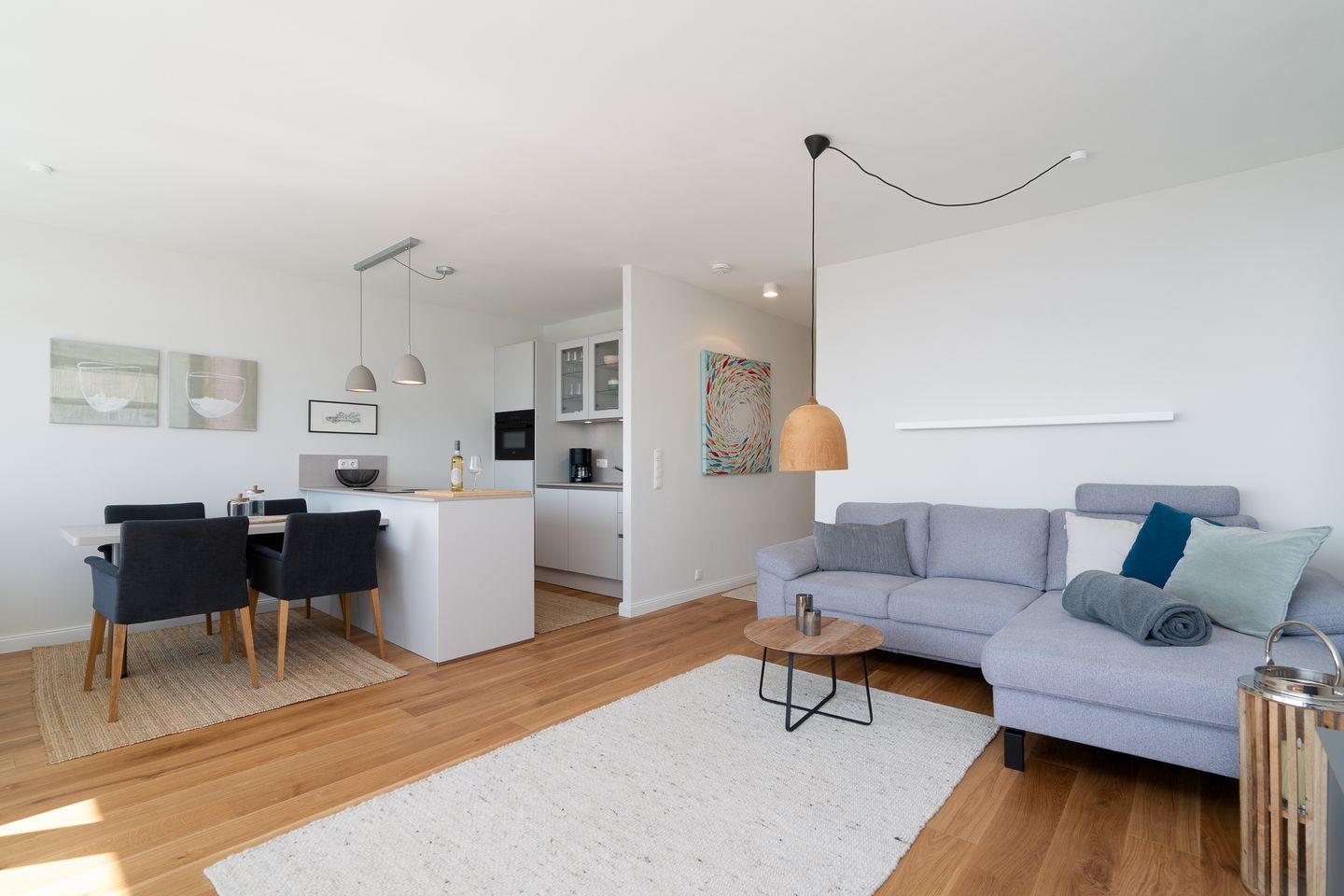 Das Apartment bietet mit seinen zwei Zimmern und einer Wohnfläche von ca. 50 m² Platz für bis zu zwei Personen. Das separate Schlafzimmer mit Oberlicht ist mit einem bequemen Doppelbett (160 x 200 cm) ausgestattet. Die moderne Küche ist in den Wohn- und Essbereich integriert und verfügt über Backofen, Herd und Spülmaschine. Am Esstisch finden Sie ausreichend Platz für gemeinsame Mahlzeiten und die gemütliche Sofaecke lädt zum Entspannen ein. Das Badezimmer mit Oberlicht ist mit einer bodengleichen Dusche, WC, Waschbecken und Spiegel modern und geräumig gestaltet.