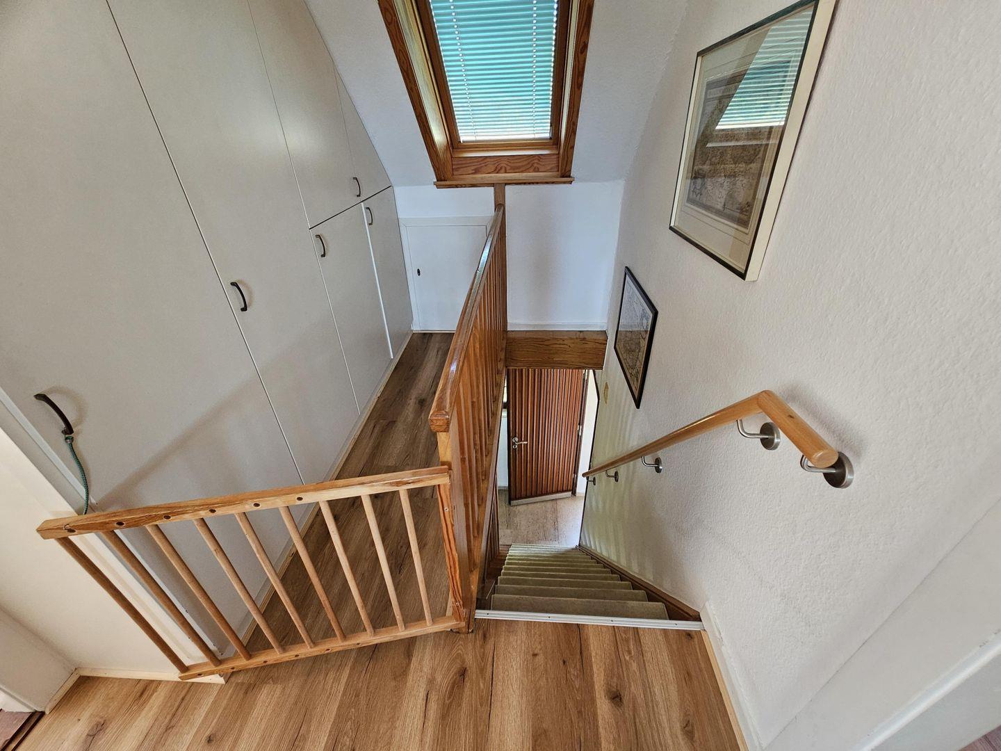 Das Ferienhaus ist im Obergeschoß aufgeteilt in drei Schlafzimmer (2x Doppelbett, 2 x Einzelbett (1 x ausziehbar)) und ein Bad mit Dusche, Badewanne, Bidet und Waschbecken.