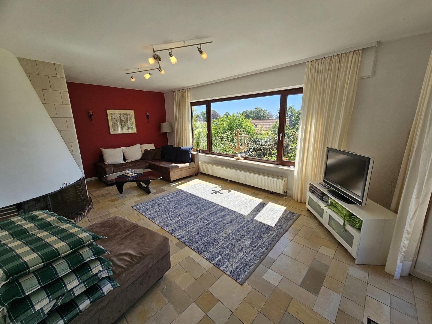 Im Erdgeschoß befindet sich ein Gäste-WC, eine neue Küche mit Spülmaschine, Backofen, Herd, Kühlschrank mit Gefrierfach, ein großer Abstellraum, sowie ein großzügiger Wohnraum mit offenem Kamin und einem Essbereich. Vom Wohnzimmer und dem Essbereich bietet sich ein Panoramablick in den großzügigen Garten und im Frühjahr bis zur Ostsee.