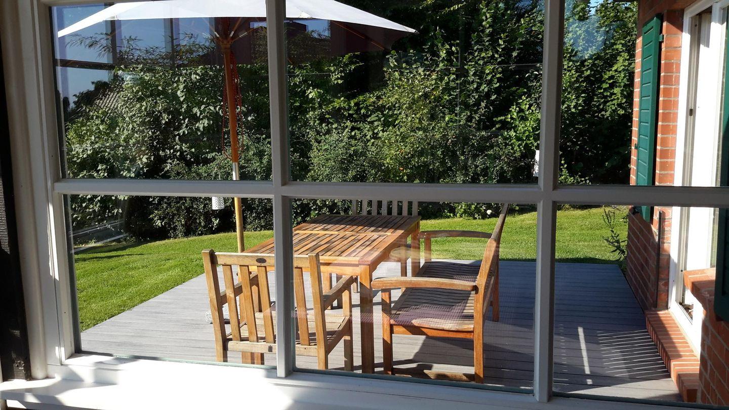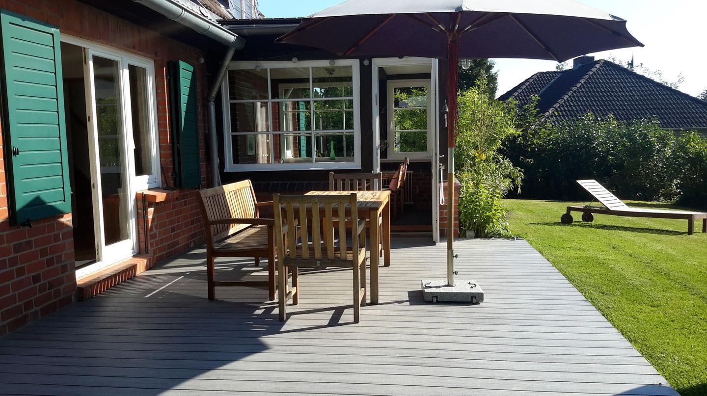 Vom Esszimmer und vom Wohnzimmer aus gelangen sie auf die schöne Holz-Terrasse, die komplett mit Tisch, Stühlen, Bank und Sonnenschirm möbliert ist.