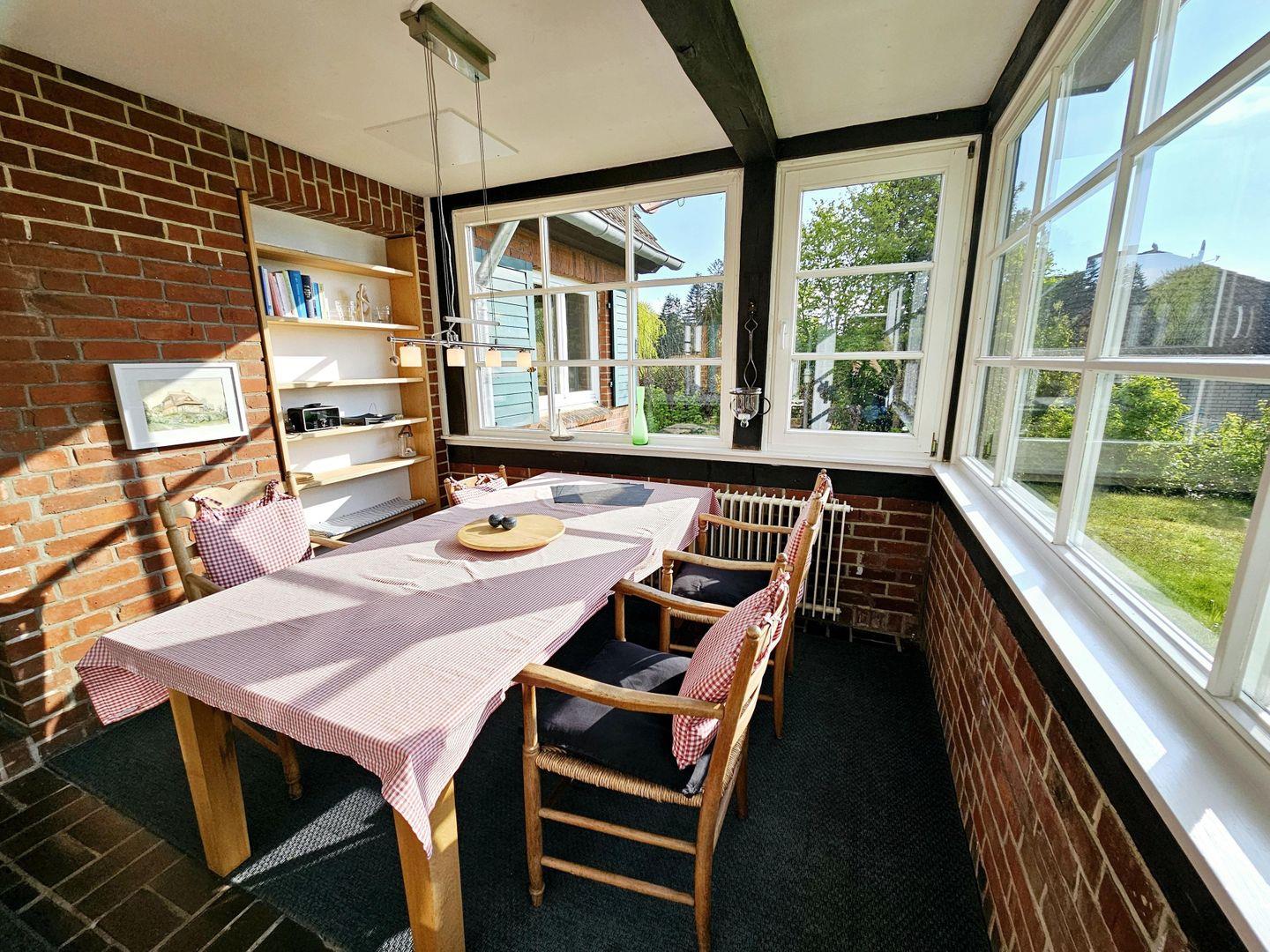 Das Esszimmer ist im komplett verglasten Veranda-Anbau untergebracht.