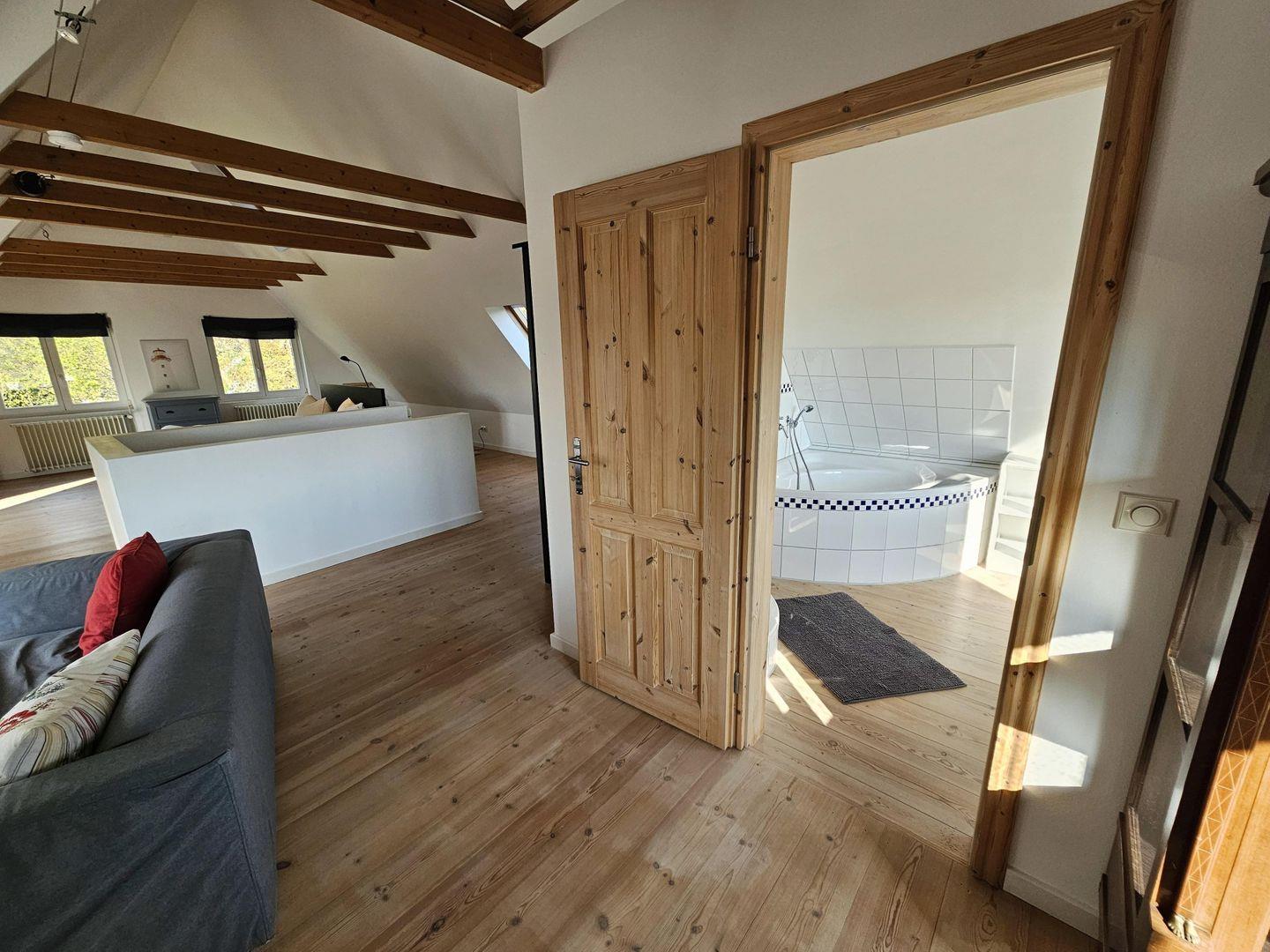 Im Obergeschoss finden Sie ein Badezimmer mit Dusche und Eckbadewanne sowie WC und Waschbecken vor.