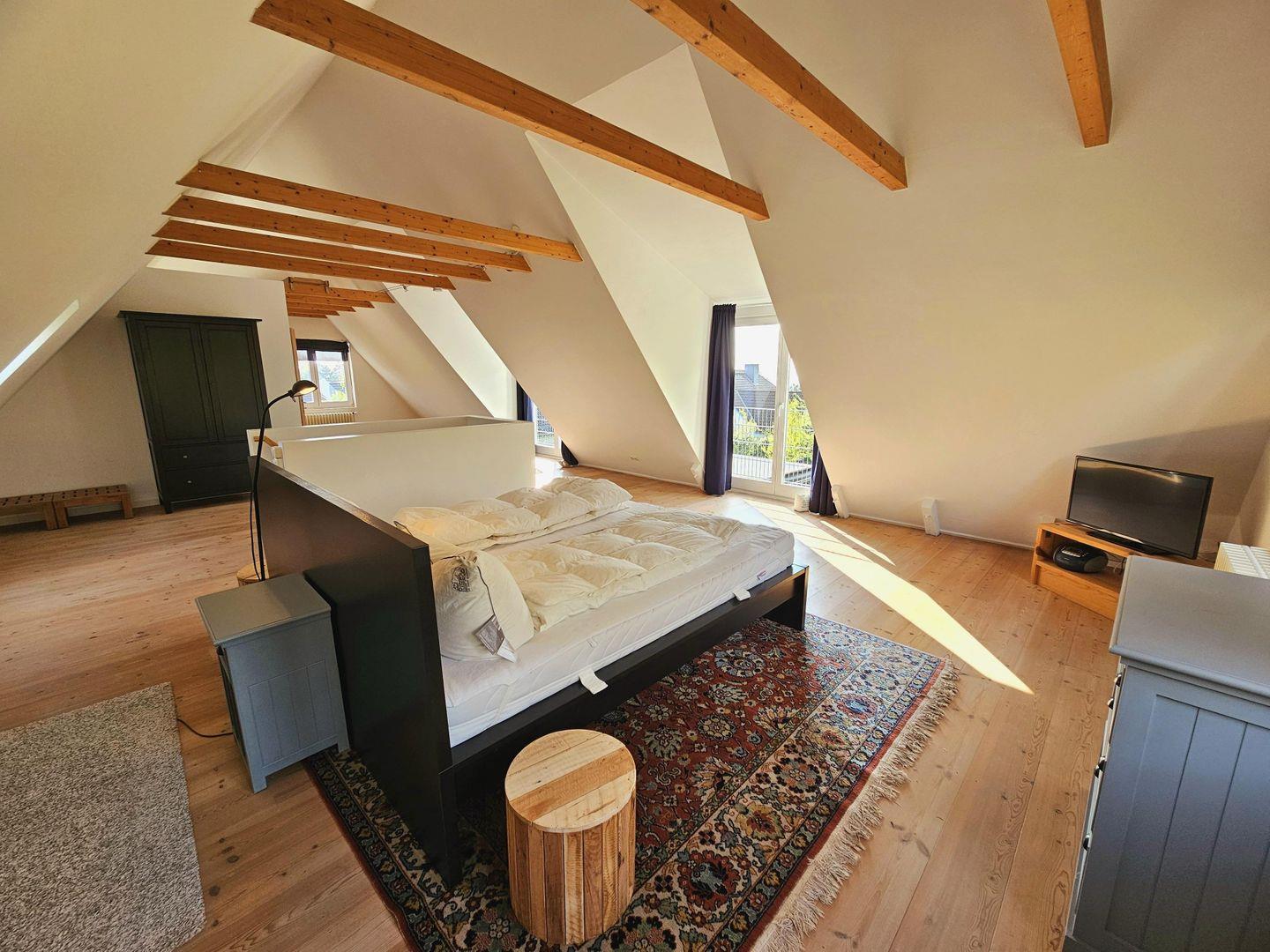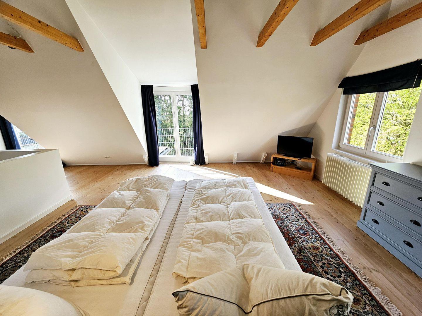 Ein Schlafzimmer im Obergeschoss mit einem Doppelbett (zwei Matratzen 0,90 x 2,00 m). Hier ist ein zweiter Fernseher untergebraucht, sowie eine Stereoanlage mit CD-/DVD-Player.