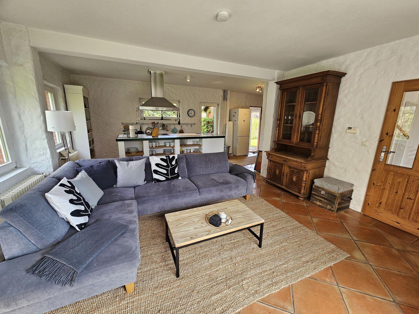 Der großzügige Wohnbereich mit integrierter Kücheninsel verfügt zusätzlich über einen dänischen Kaminofen für kühle Abende.