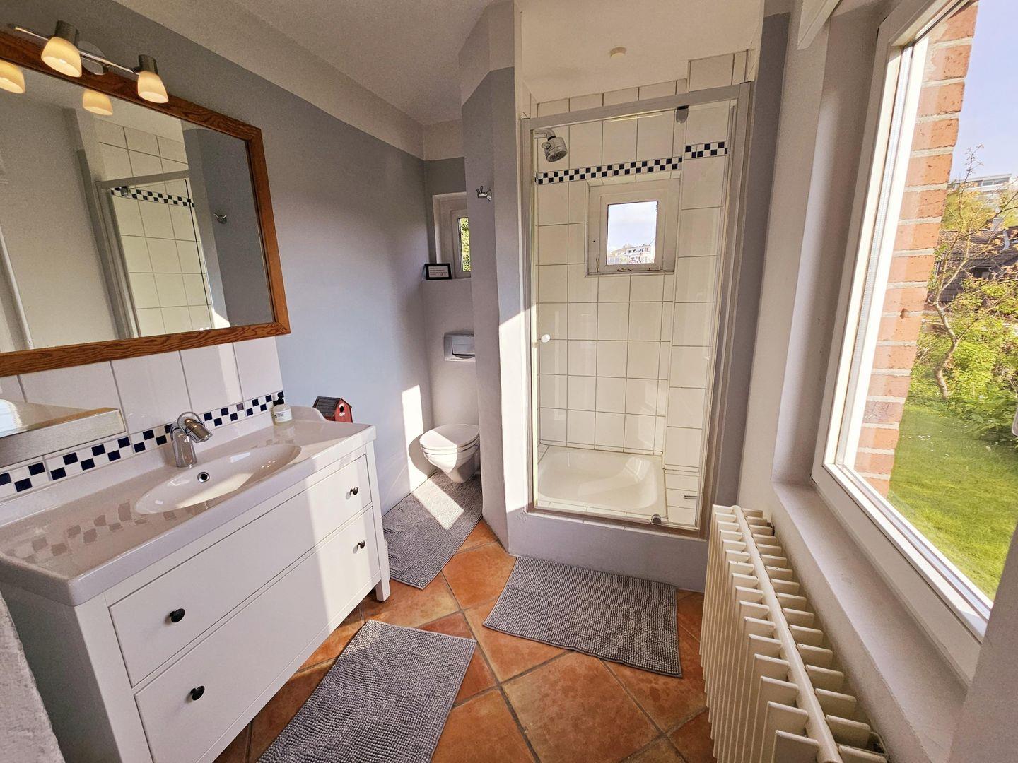 Das zweite Badezimmer im Erdgeschoss verfügt über eine Dusche, WC und Waschbecken.
