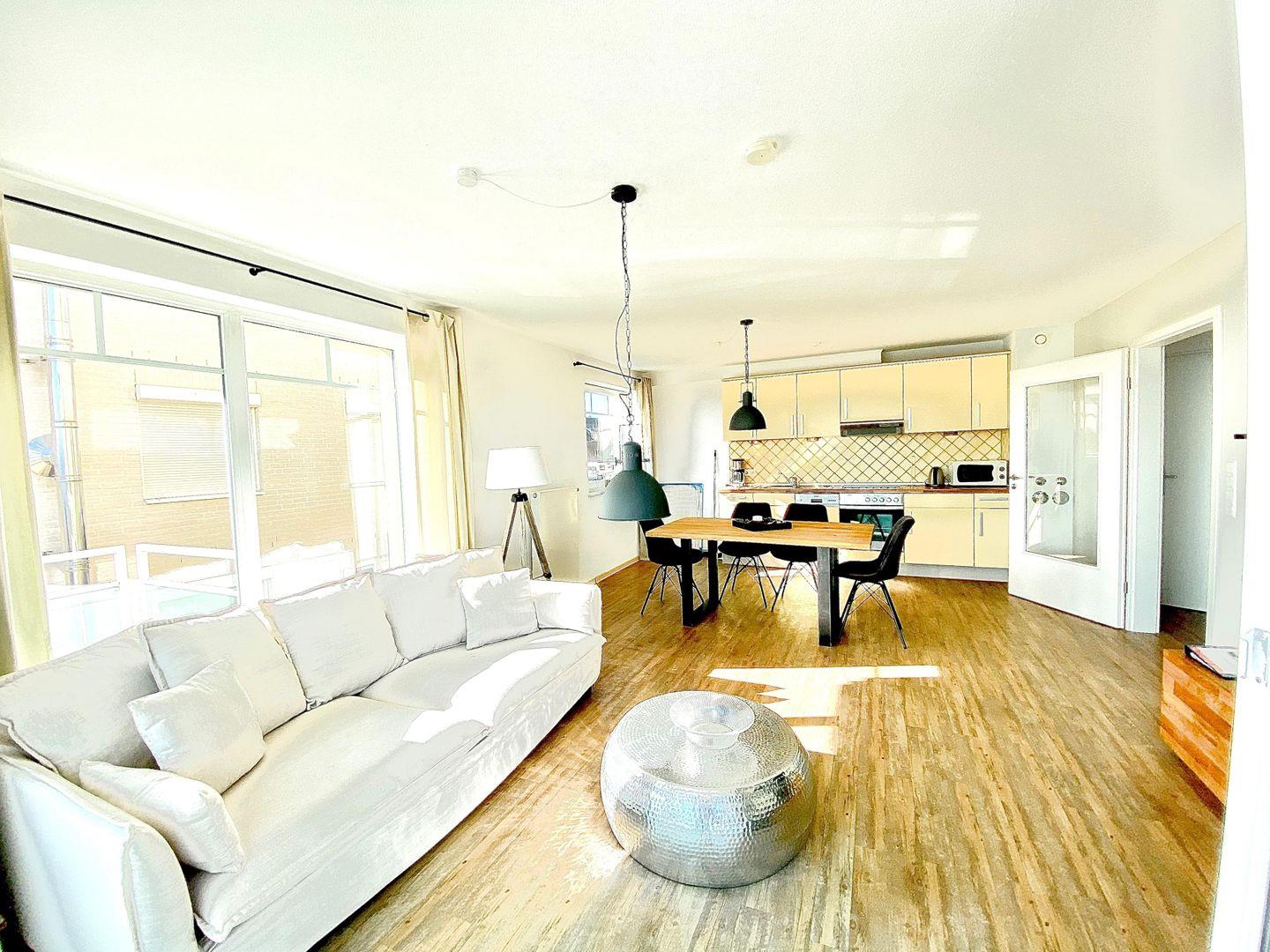 Die Ferienwohnung wurde mit neuen hellen Möbeln eingerichtet und verfügt über einen kombinierten Wohn- und Essbereich, ein Schlafzimmer mit Fenster und ein helles Duschbad mit Fußbodenheizung und Fenster.