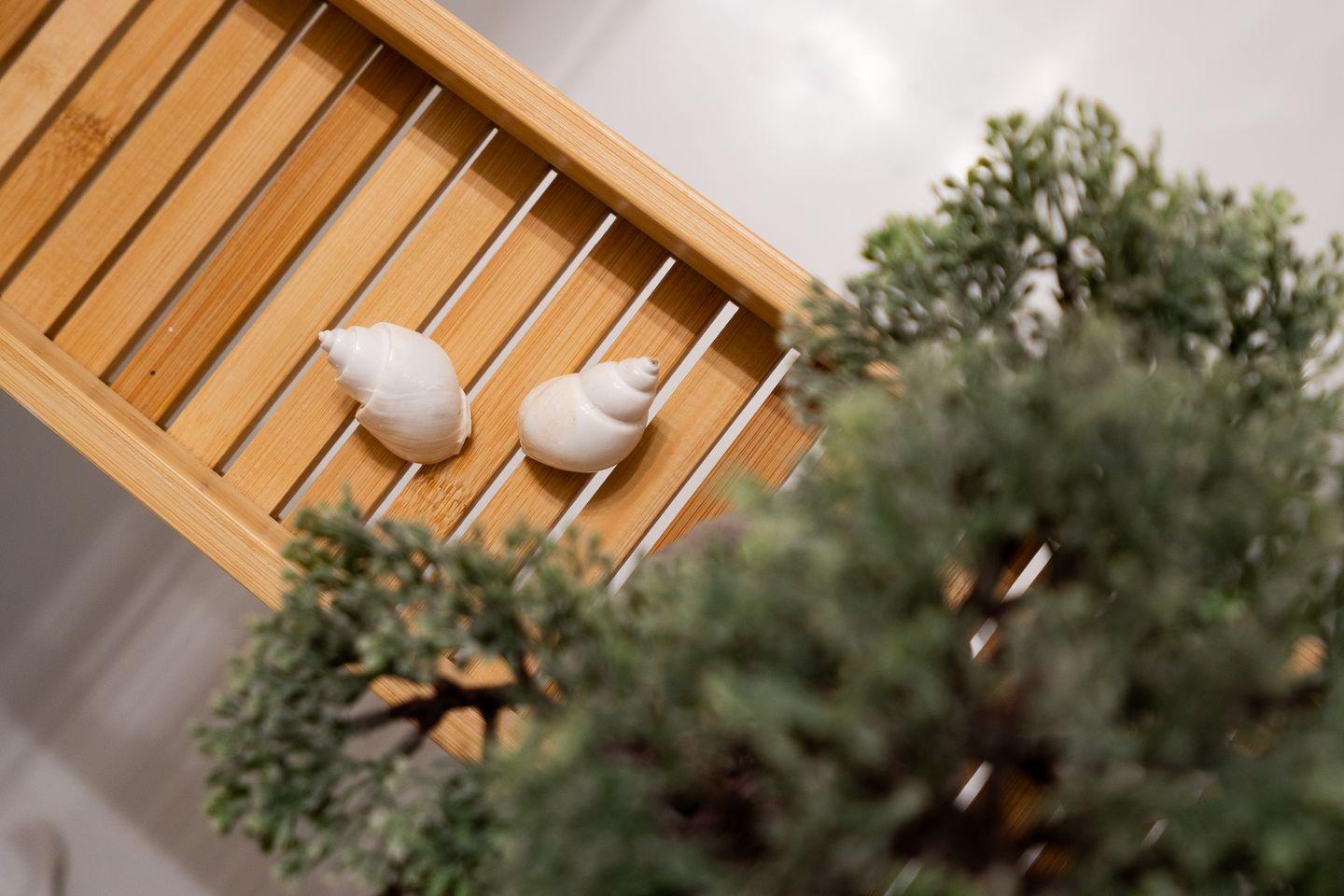 Das Apartment ist etwa 50 m² groß und ist für bis zu drei Personen geeignet. Der Wohnbereich ist sehr hell und wohnlich eingerichtet. Die offene Küche ist zum Wohnzimmer hin ausgerichtet und mit Backofen und Herd ausgestattet, sodass Sie sich in Ihrem Urlaub mühelos selbst versorgen können. Eine Spülmaschine ist in der kleinen Abstellkammer untergebracht. Ein Esstisch bietet ausreichend Platz für gemeinsame Mahlzeiten. Der angrenzende, überdachte Balkon lädt mit einem schönen Blick auf die Umgebung und bequemen Gartenmöbeln zum Verweilen ein – hier können Sie entspannen, lesen oder einfach die frische Ostseeluft genießen.