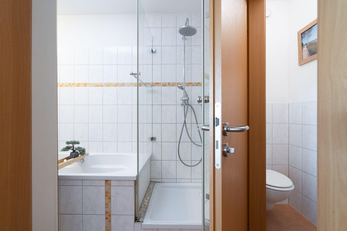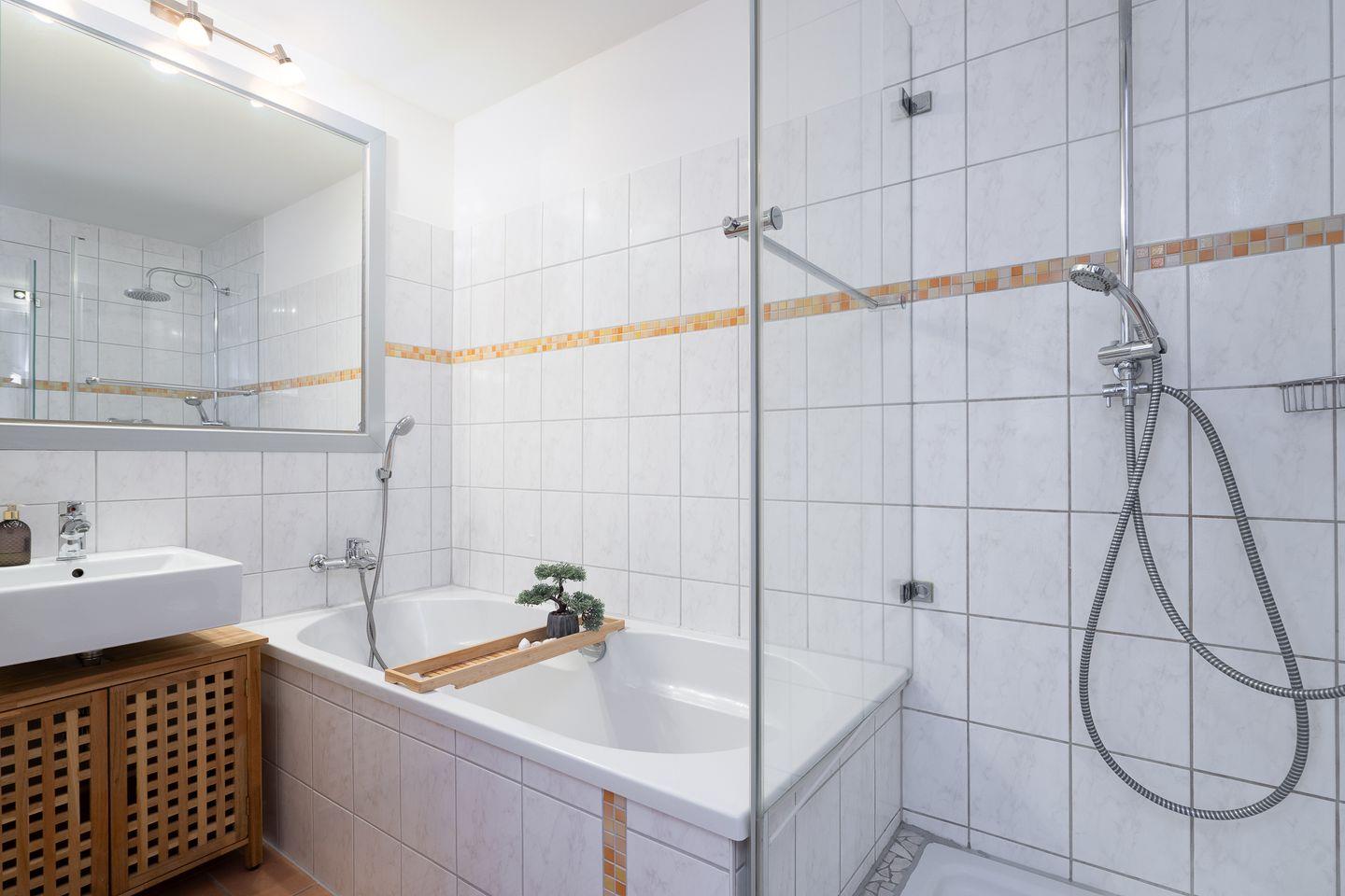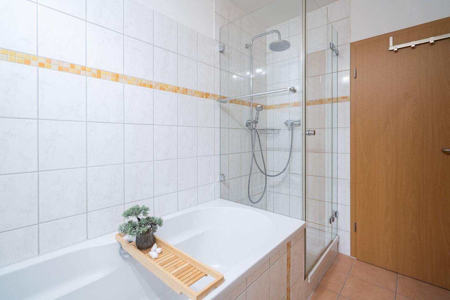 Das separate Schlafzimmer verfügt über ein bequemes Doppelbett (2x 90 cm x 200 cm) und hat einen großen Kleiderschrank. Im Wohnzimmer befindet sich eine Schlafcouch (90 x 190 cm), auf der eine Person nächtigen kann. Ein modernes Badezimmer bietet eine Dusche und eine Badewanne, sowie ein abgetrenntes WC.