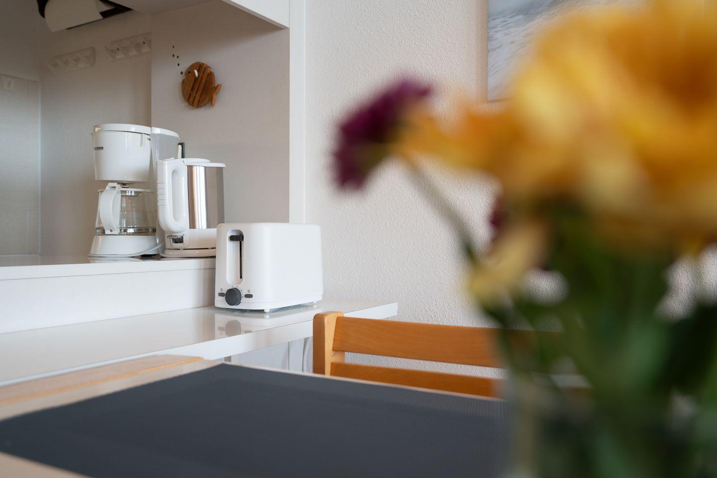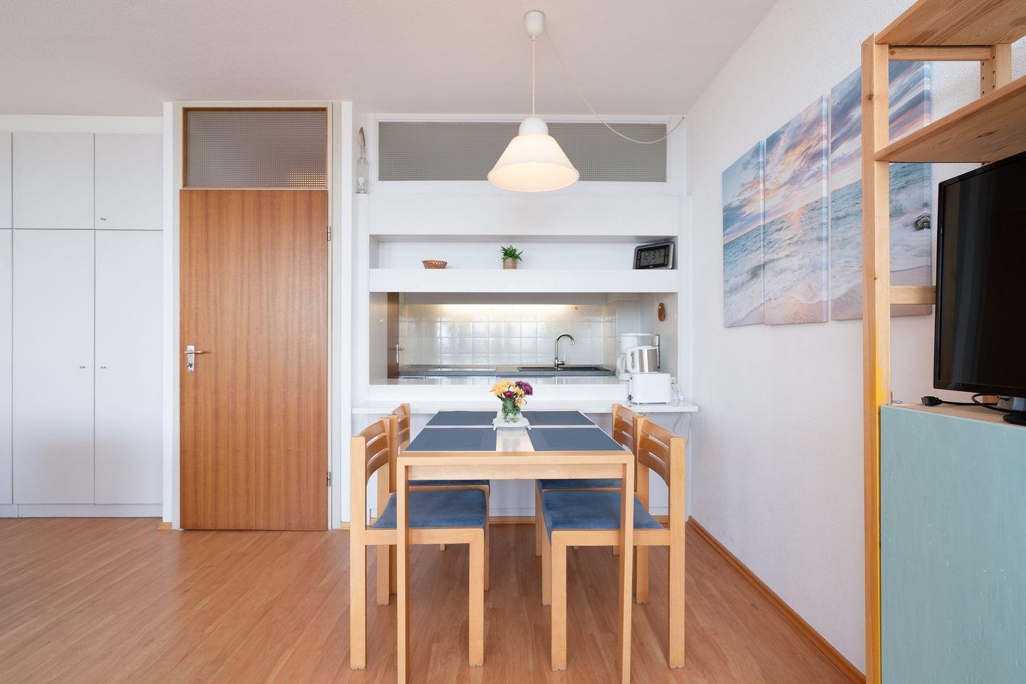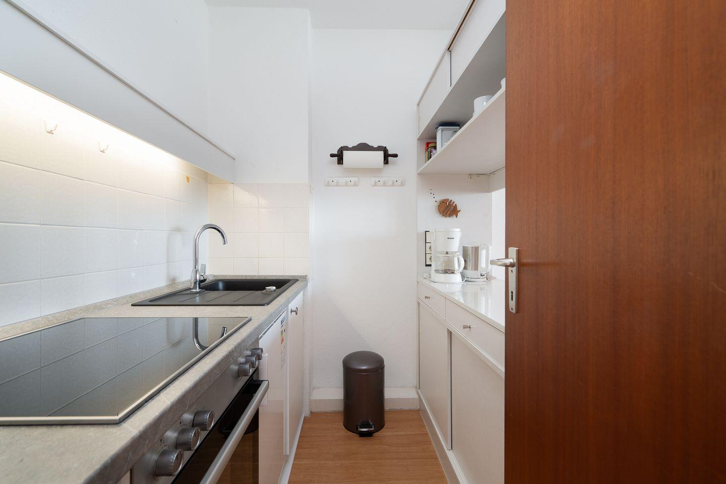 Die Küche mit Ceranherd, Backofen, Kühlschrank mit Gefrierfach, Kaffeemaschine, Wasserkocher, Toaster sowie Küchenutensilien und Geschirr bietet alles, was Sie zur Selbstverpflegung benötigen. Ein Badezimmer mit Dusche, Waschbecken, WC und Spiegel steht zur Verfügung. Im Wohnbereich erwartet Sie ein TV und ein Radio, WLAN sowie ein Schreibtisch, falls Sie während Ihres Aufenthalts arbeiten möchten.