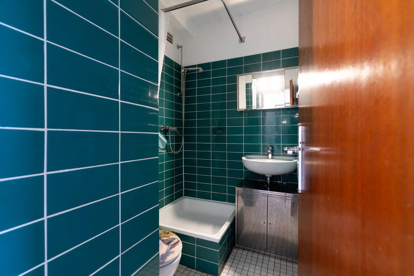 Das Badezimmer ist mit einer Dusche, Waschbecken, Spiegel und WC praktisch ausgestattet und innenliegend.