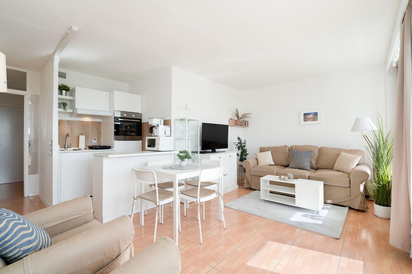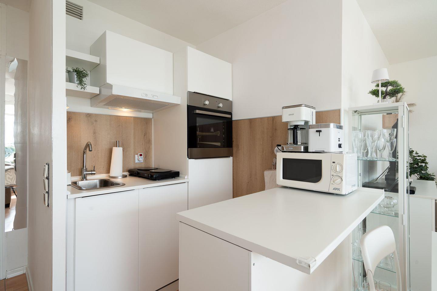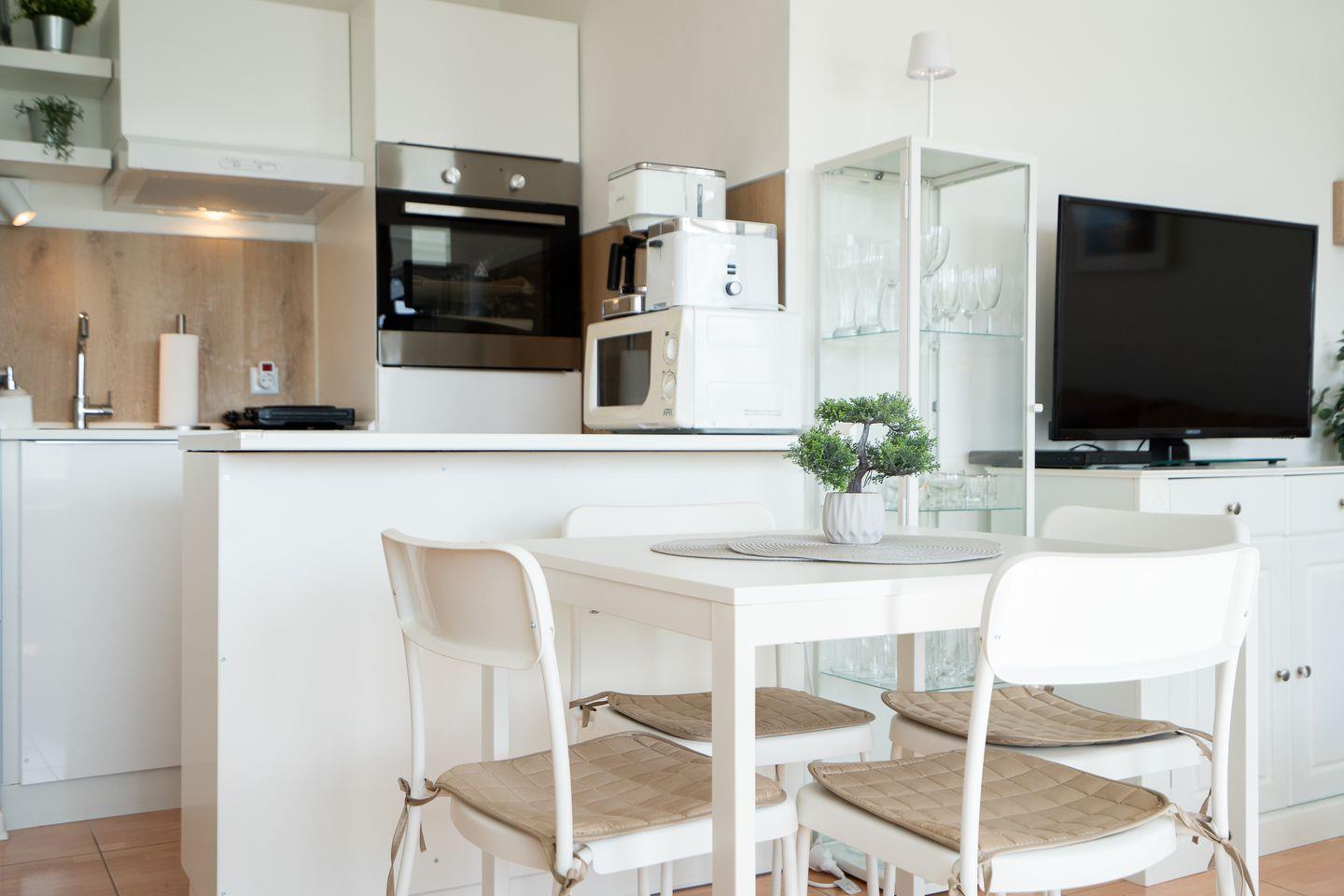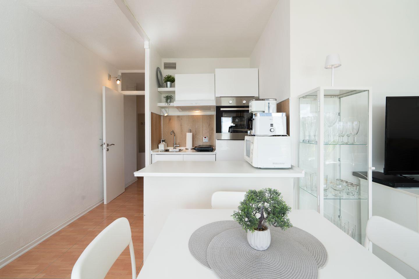 Das modern ausgestattete Appartement verfügt über ein separates Schlafzimmer sowie einen hellen, offen gestalteten Wohn- und Essbereich. Die gemütliche Sofaecke lädt zum Entspannen ein und ist mit TV, DVD-Player und Radio ausgestattet. WLAN steht selbstverständlich zur Verfügung. Die offene Küche grenzt an das Wohnzimmer und ist mit einem Ceranherd, Backofen, Mikrowelle, Kühlschrank mit integriertem Gefrierfach, Spülmaschine, Kaffeemaschine, Wasserkocher, Toaster sowie sämtlichem benötigten Küchenzubehör komplett ausgestattet. Damit stehen Ihnen alle Möglichkeiten für eine individuelle Selbstversorgung offen.
