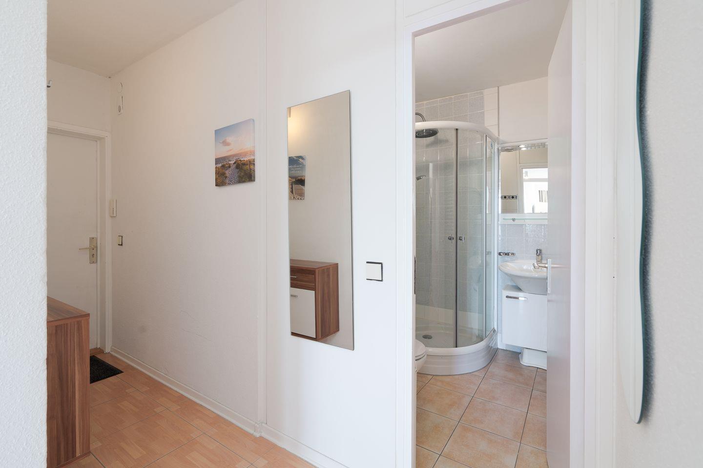 Im Badezimmer finden Sie eine Dusche mit Wanne, Waschbecken, WC und Haartrockner. Für Familien mit Kindern ist der Aufenthalt besonders angenehm: Kinder sind willkommen, es gibt einen Spielplatz auf dem Gelände und eine Vielzahl an Freizeitmöglichkeiten wie einen beheizten Indoor-Pool, Tennisplatz, Tischtennis, Kicker und zahlreiche Angebote für Sportbegeisterte wie Beachvolleyball, Basketball und Fußball. Zum weiteren Komfort zählen gemeinschaftlich nutzbare Waschmaschine und Trockner, ein Staubsauger sowie ausreichend Stauraum in Garderobe und Kommode.