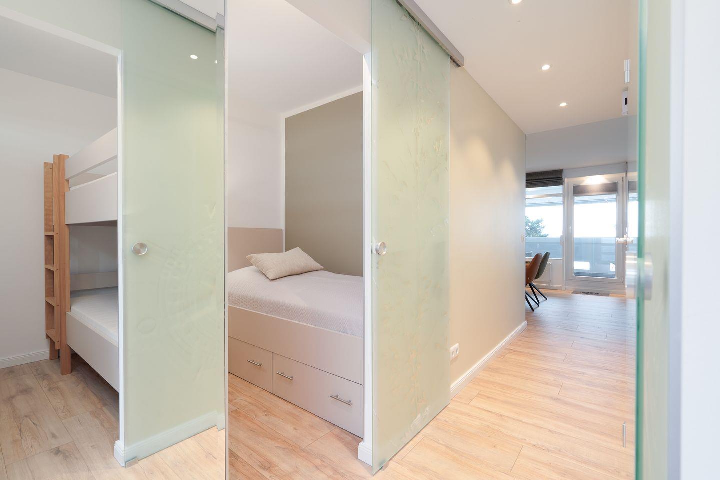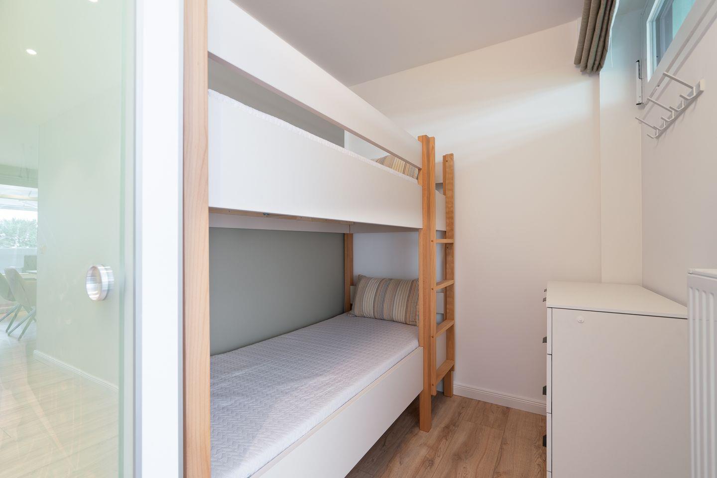 Das 48 m² große Apartment hat zwei separate Schlafzimmer und bietet insgesamt vier Schlafmöglichkeiten, und ist somit ideal für den Familienurlaub. Im ersten Schlafzimmer stehen zwei Einzelbetten (jeweils 90 x 190 cm), im zweiten Schlafzimmer steht ein Etagenbett (jeweils 80 x 190 cm). Das modern gestaltete Wohnzimmer verfügt über eine gemütliche Sofaecke, einen großen Flachbildfernseher sowie kostenloses WLAN und lädt zum Entspannen nach einem erlebnisreichen Tag ein. Der Essbereich verbindet den Wohnraum offen mit der vollständig ausgestatteten Küche, die Ihnen alles bietet, was Sie für eine komfortable Selbstversorgung benötigen. Das moderne, innenliegende Bad verfügt über eine bodentiefe Dusche.