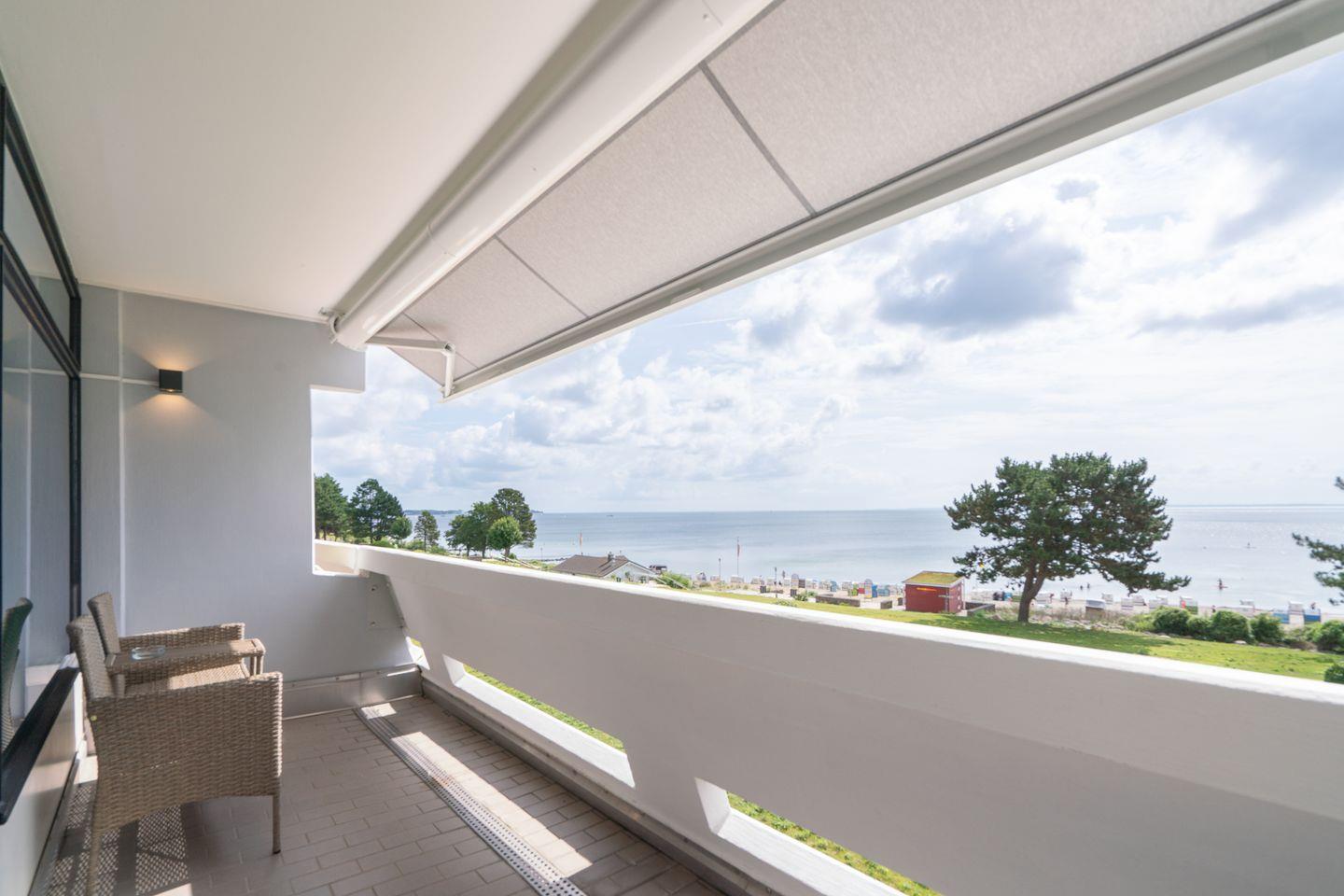 Ein Highlight des Apartments ist der überdachte Balkon mit Markise, von dem Sie die frische Ostseeluft sowie den außergewöhnlichen Meerblick genießen können. Sonne, Wind und das Rauschen der Wellen werden hier zum ständigen Begleiter Ihres Aufenthalts.
