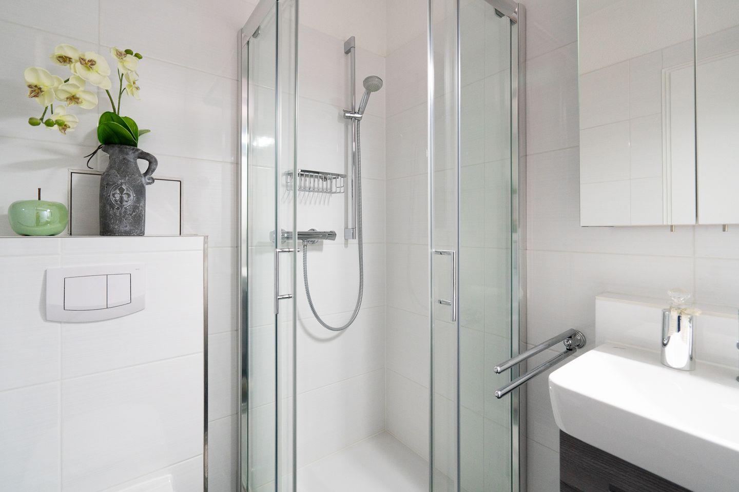 Die Unterkunft verfügt über ein separates Schlafzimmer mit zwei Einzelbetten (jeweil 80 x 200 cm), die man nicht zusammenstellen kann. Das moderne und hell geflieste Badezimmer ist innenliegend und verfügt über eine Dusche, Waschtisch, Spiegel und ein WC.