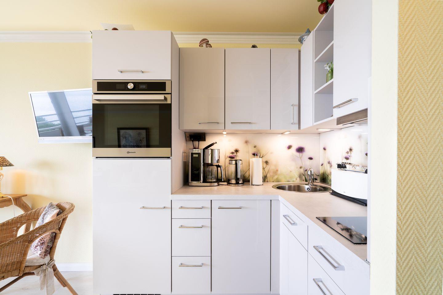 Die offene Küche ist mit Spülmaschine, Herd und Backofen ausgestattet und bietet Ihnen alles, um sich im Urlaub selbst versorgen zu können. Im kombinierten Wohn- und Essbereich erwartet Sie eine Sofaecke mit TV und Radio, sowie ein Esstisch.