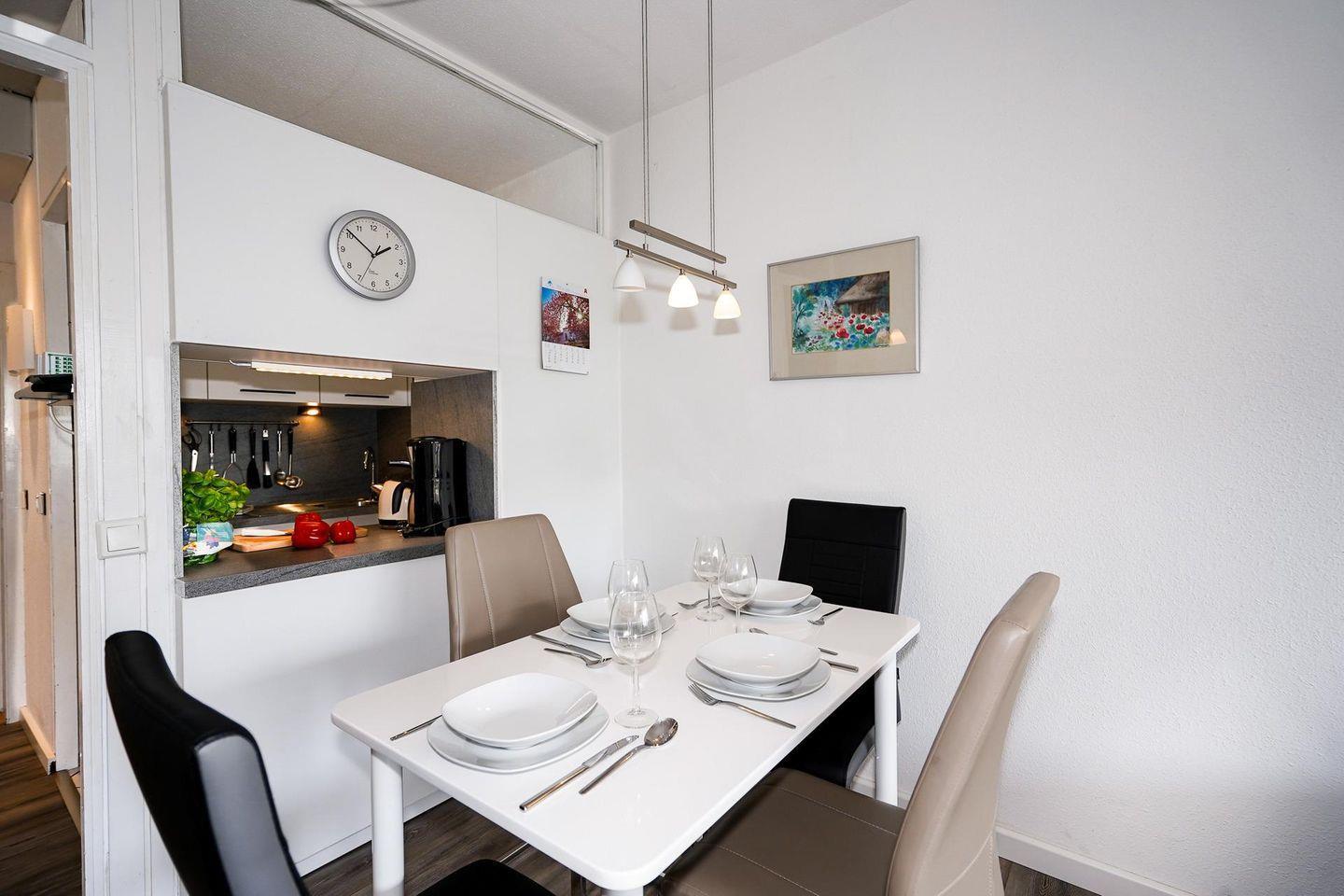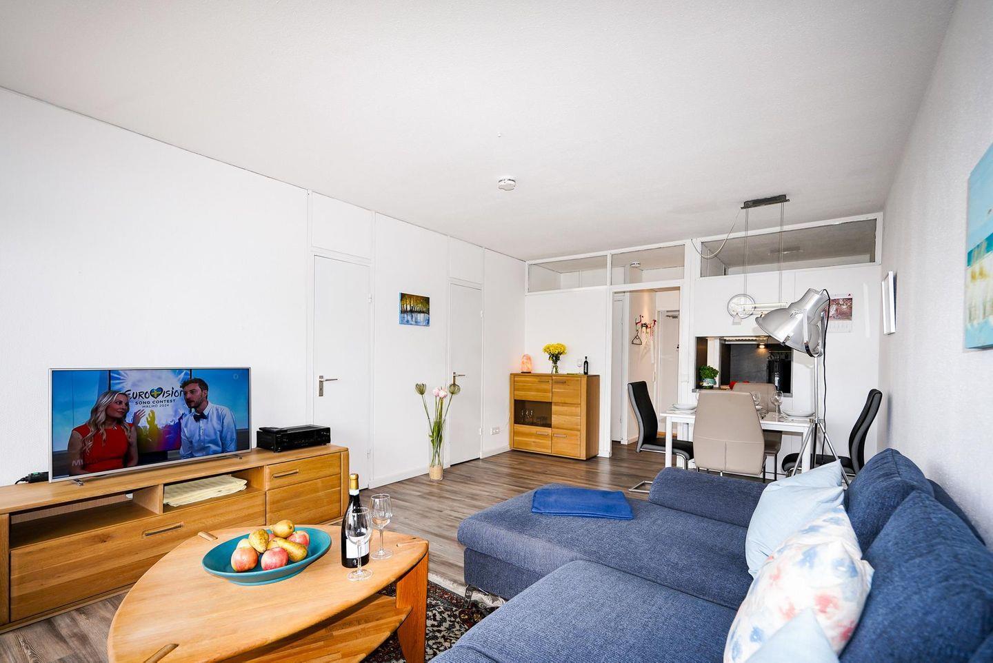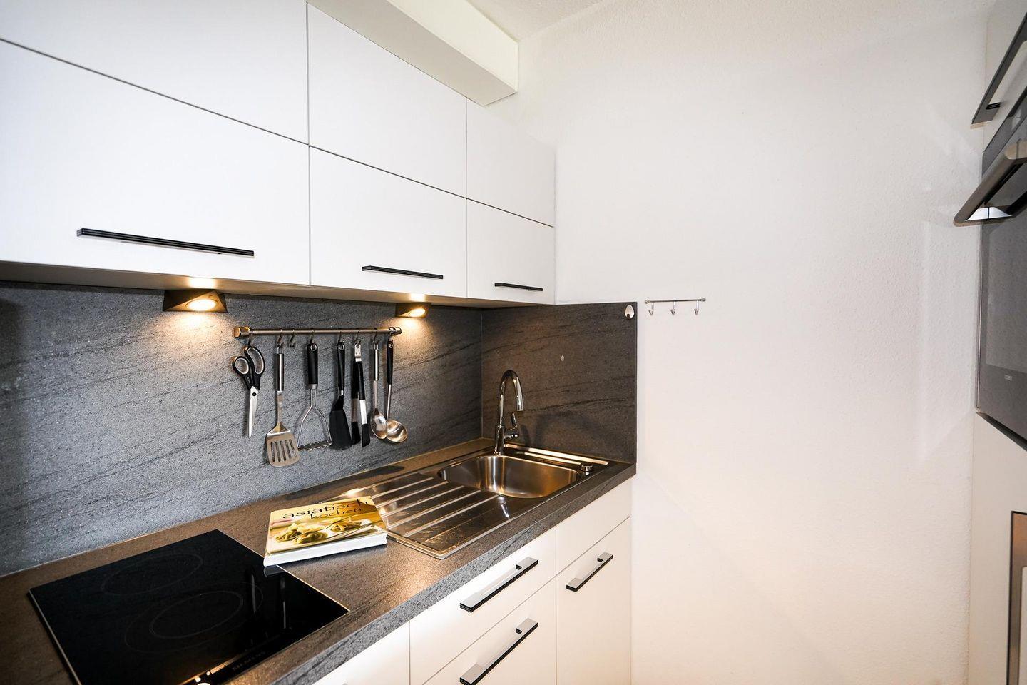 Meerblick-Apartment. Das gemütlich und modern eingerichtete und gepflegte Apartment kann mit dem Fahrstuhl bequem erreicht werden und bietet 4 Feriengästen Platz. Der helle Wohnraum ist mit einer bequemen Polsterlandschaft sowie einem ansprechenden Essbereich und hochwertigen Echtholzmöbeln eingerichtet. In der Einbauküche sind alle Geräte und Kochutensilien enthalten, um auch mal eigene Gerichte zuzubereiten. Der Kühlschrank beinhaltet ein kleines Gefrierfach.