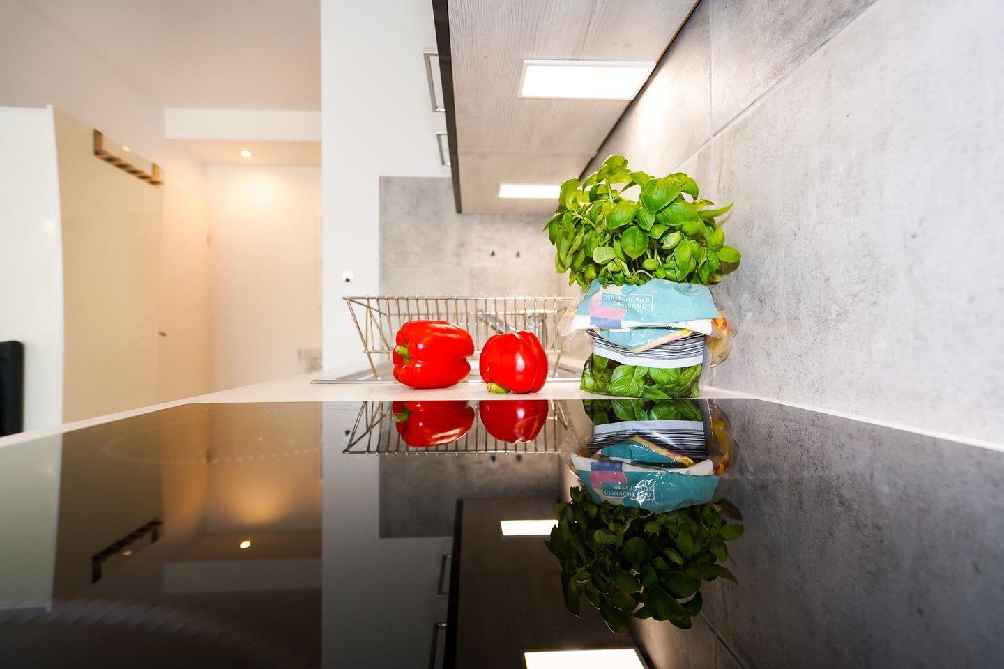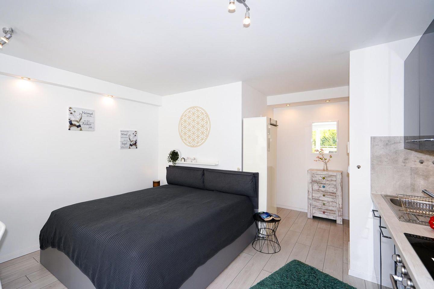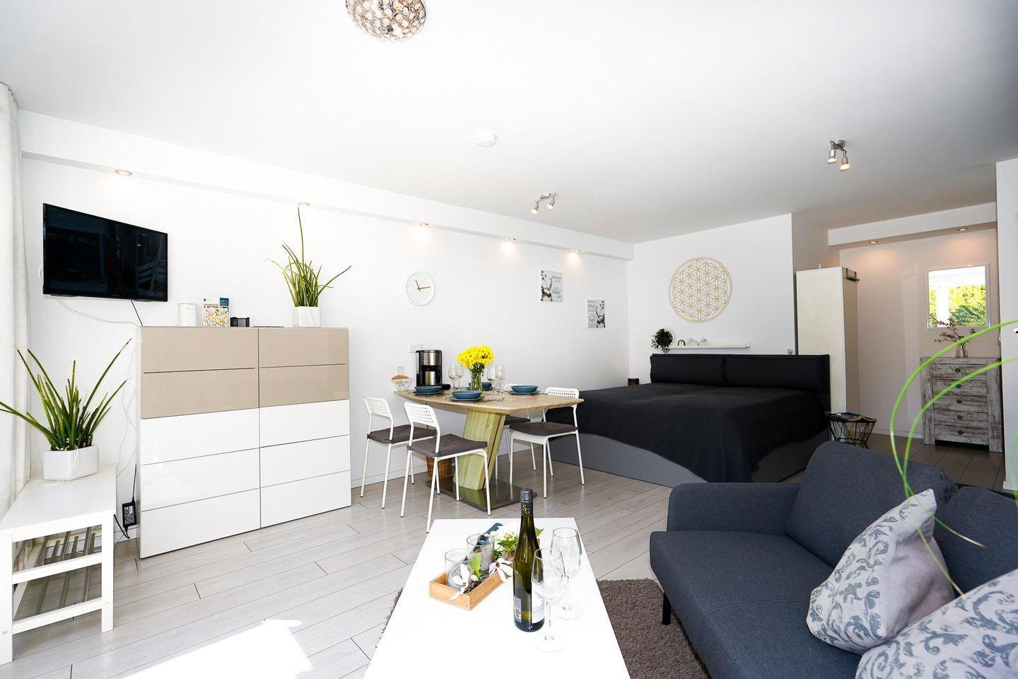 Der helle Wohnraum ist mit einer bequemen Polsterlandschaft sowie einem ansprechenden Essbereich und hochwertigen Echtholzmöbeln eingerichtet. In der Einbauküche sind alle Geräte und Kochutensilien enthalten, um auch mal eigene Gerichte zuzubereiten. Im Wohn-/Schlafbereich können Sie auf dem bequemen Boxspringbett (1,80 x 2,00) entspannen und ausruhen. Das geräumige Bad verfügt über eine Dusche. Ein großer Flachbildfernseher im Wohnzimmer zählt natürlich ebenso zur Einrichtung des Apartments. Der ca. 14 qm große Balkon verwöhnt mit einer Aussicht ins Grüne. Hunde sind in der Ferienwohnung stets gern gesehene Gäste (gegen Gebühr).