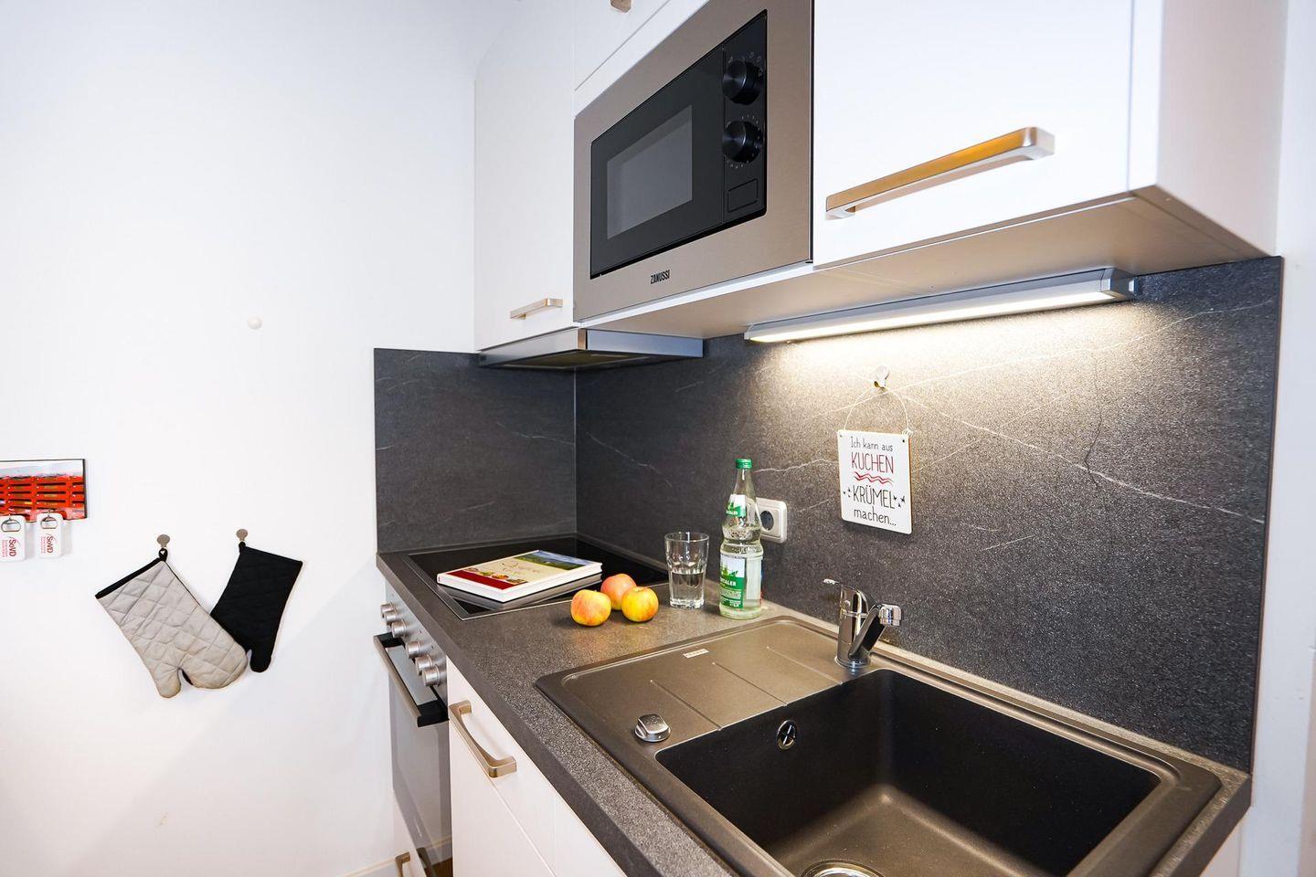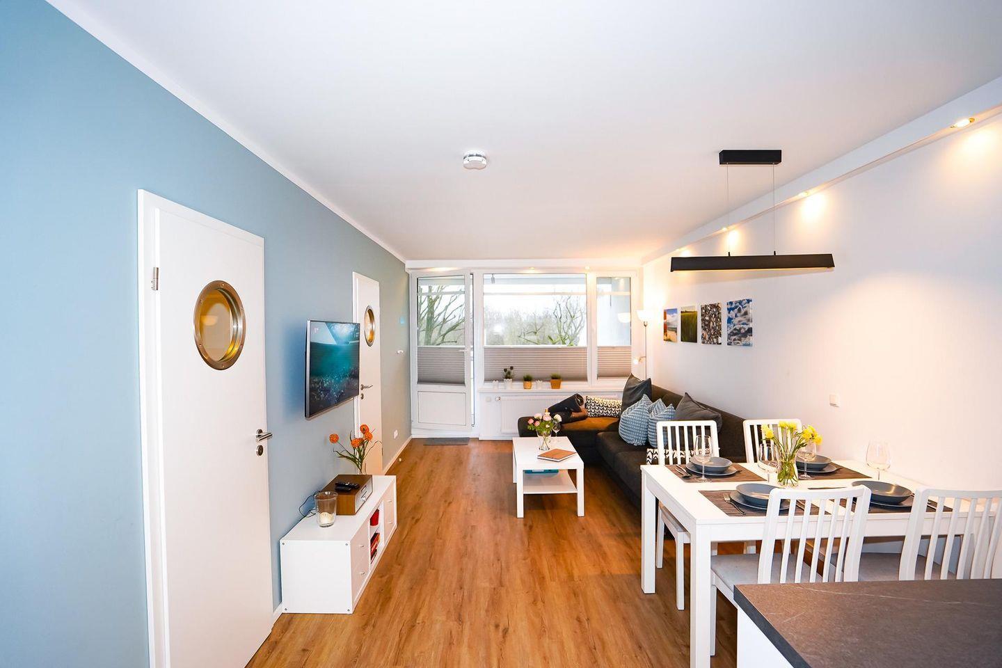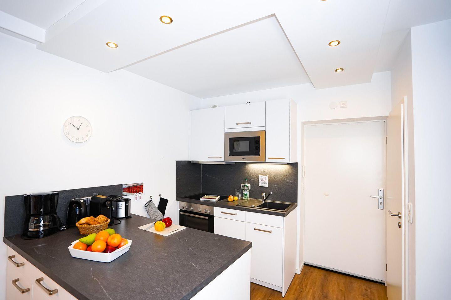 Das gemütlich und modern eingerichtete und gepflegte Apartment kann mit dem Fahrstuhl bequem erreicht werden und bietet 4 Feriengästen Platz. Der helle Wohnraum verfügt über eine offene Küche und ist mit einer bequemen Polsterlandschaft sowie einem ansprechenden Essbereich eingerichtet. In der offenen Einbauküche sind alle Geräte und Kochutensilien enthalten, um auch mal eigene Gerichte zuzubereiten. Zur Ausstattung gehört neben einer Filterkaffeemaschine auch eine Nespresso-Maschine.