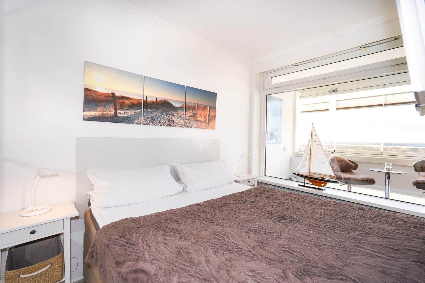 Der Schlafraum ist ausgestattet: ein Boxspringbett ca. 160 cm x 200 cm, Flachbild Wand – TV –Ambilight - 32 Zoll mit Radio, 2 Nachttische mit Schublade und Ablage, Tischlampen, Wandlampe, Spiegelkleiderschrank mit Beleuchtung, Wandgarderobe, Schiffsmodell, Rauchmelder.