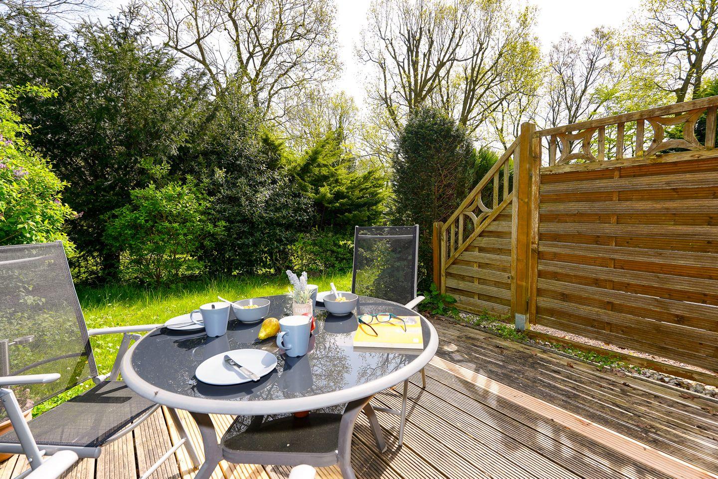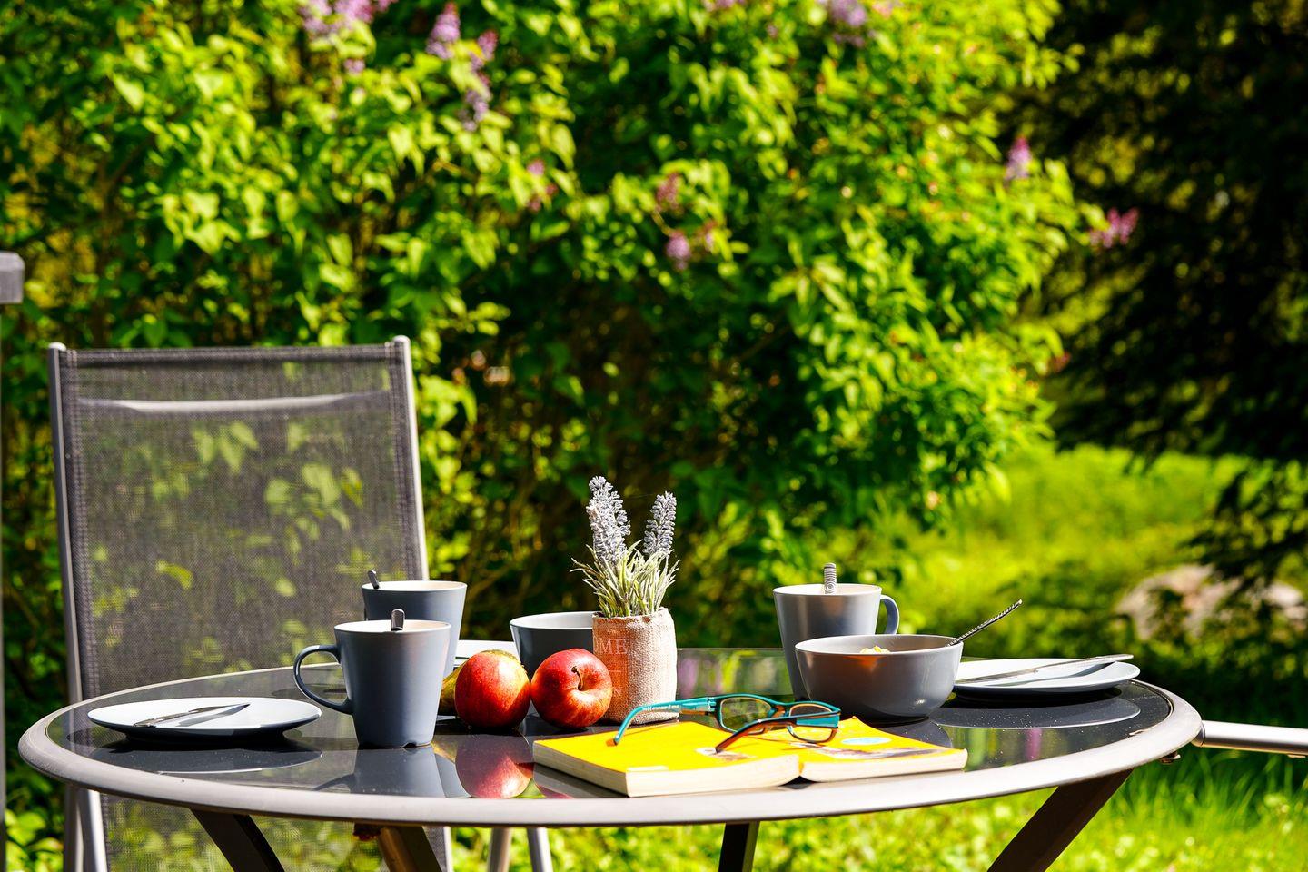 Der stilvoll eingerichtete Wohnbereich ist durch die große Fensterfront angenehm hell und verfügt über eine gemütliche Sofaecke mit Schlafcouch (140x200cm) und Blick auf den Fernseher. Ebenfalls im Wohnzimmer befindet sich ein komfortables Doppelbett (140x200cm), von dem aus Sie den Blick in den Garten genießen können