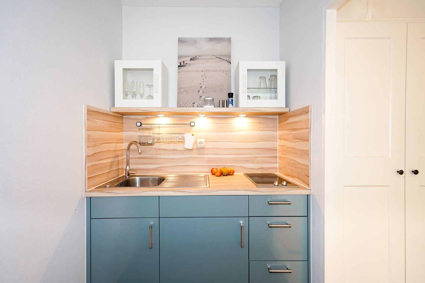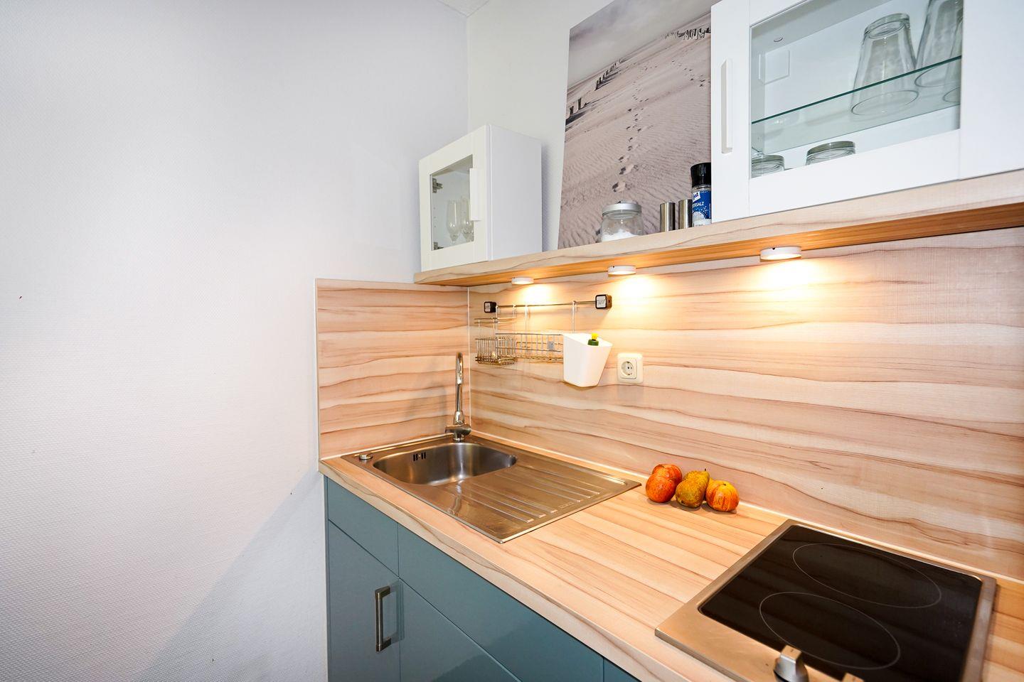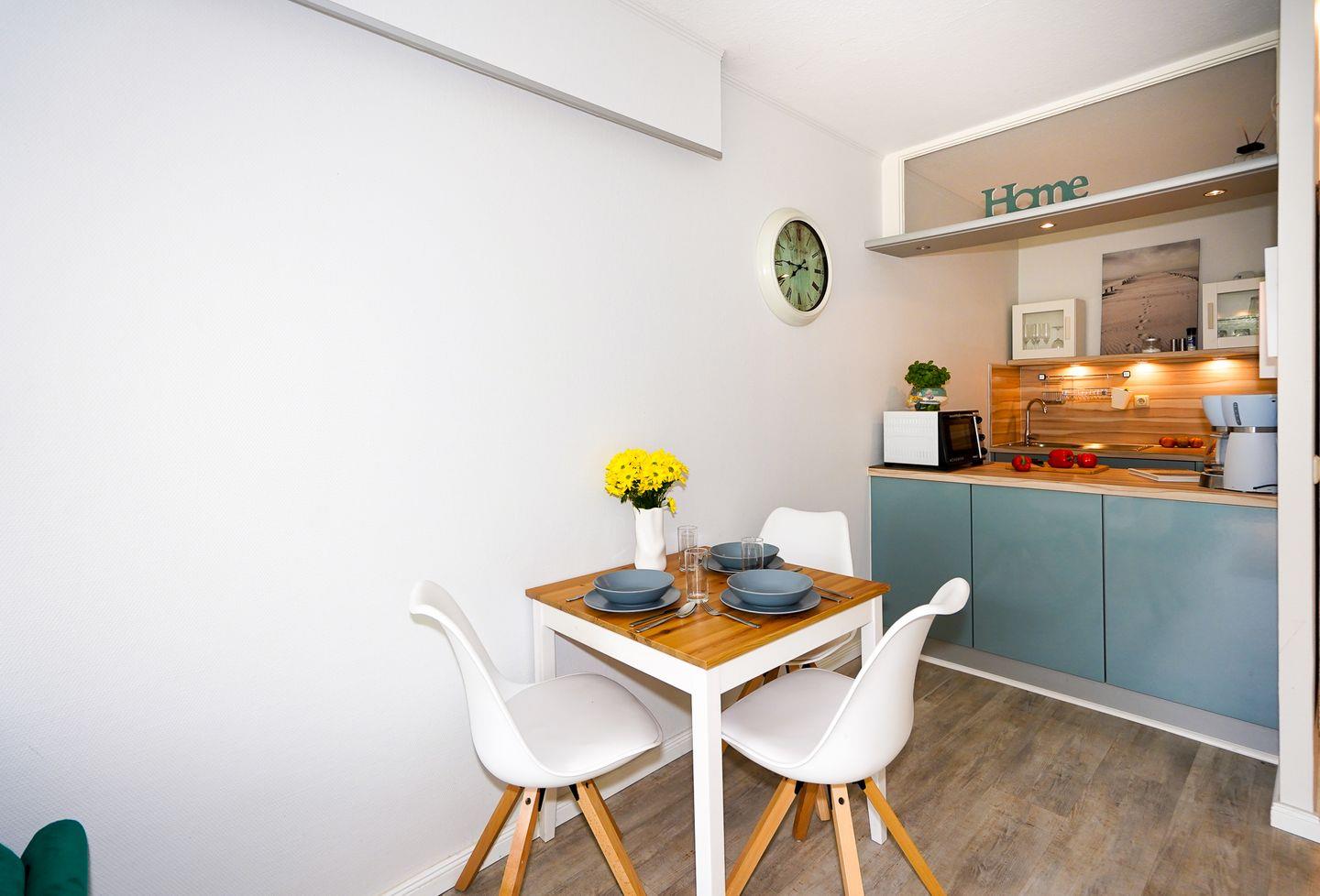 Die moderne, offene Küche grenzt direkt an den Wohnbereich und ist mit allem ausgestattet was man zur Selbstverpflegung benötigt wie Kühlschrank mit separatem Gefrierfach, Spülmaschine, Cerankochfeld, Backofen, Kaffeemaschine, Toaster und Wasserkocher. Ein Essbereich mit Esstisch lädt zu gemeinsamen Mahlzeiten ein.
