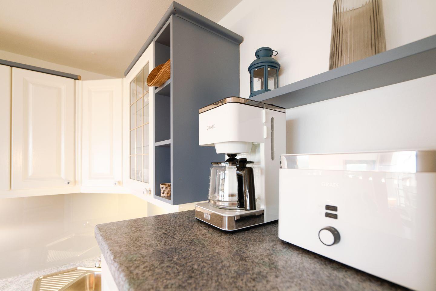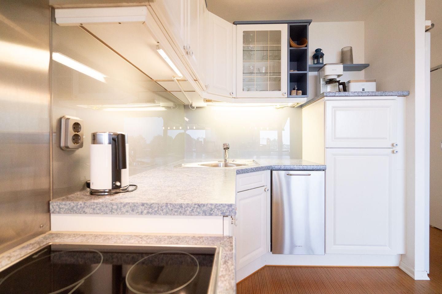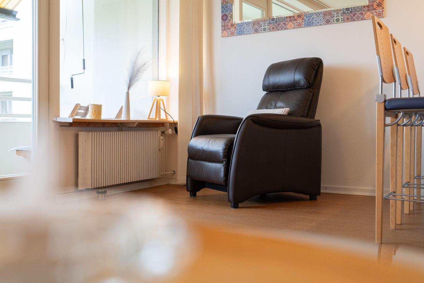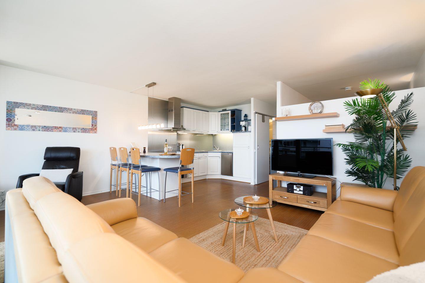 Mit einer Wohnfläche von 42 m² präsentiert sich das Apartment offen und einladend. Es verfügt über zwei Zimmer, darunter ein separates Schlafzimmer sowie einen modern gestalteten Wohnbereich mit offener Küche. Das Schlafzimmer bietet ausreichend Schlafkomfort (140 cm x 200 cm), ergänzt durch weitere Schlafmöglichkeiten im Wohnbereich (Liegefläche Schlafsofa 130 cm x 200 cm), sodass insgesamt Platz für bis zu vier Personen geboten wird. Genießen Sie gesellige Stunden in der gemütlichen Sofaecke oder lassen Sie Ihre Tage am großzügigen Esstisch ausklingen. Die bestens ausgestattete Küche ist offen in das Wohnzimmer integriert und verfügt über alles was man zur Selbstverpflegung benötigt: Cerankochfeld, Spülmaschine, Backofen und Mikrowelle.