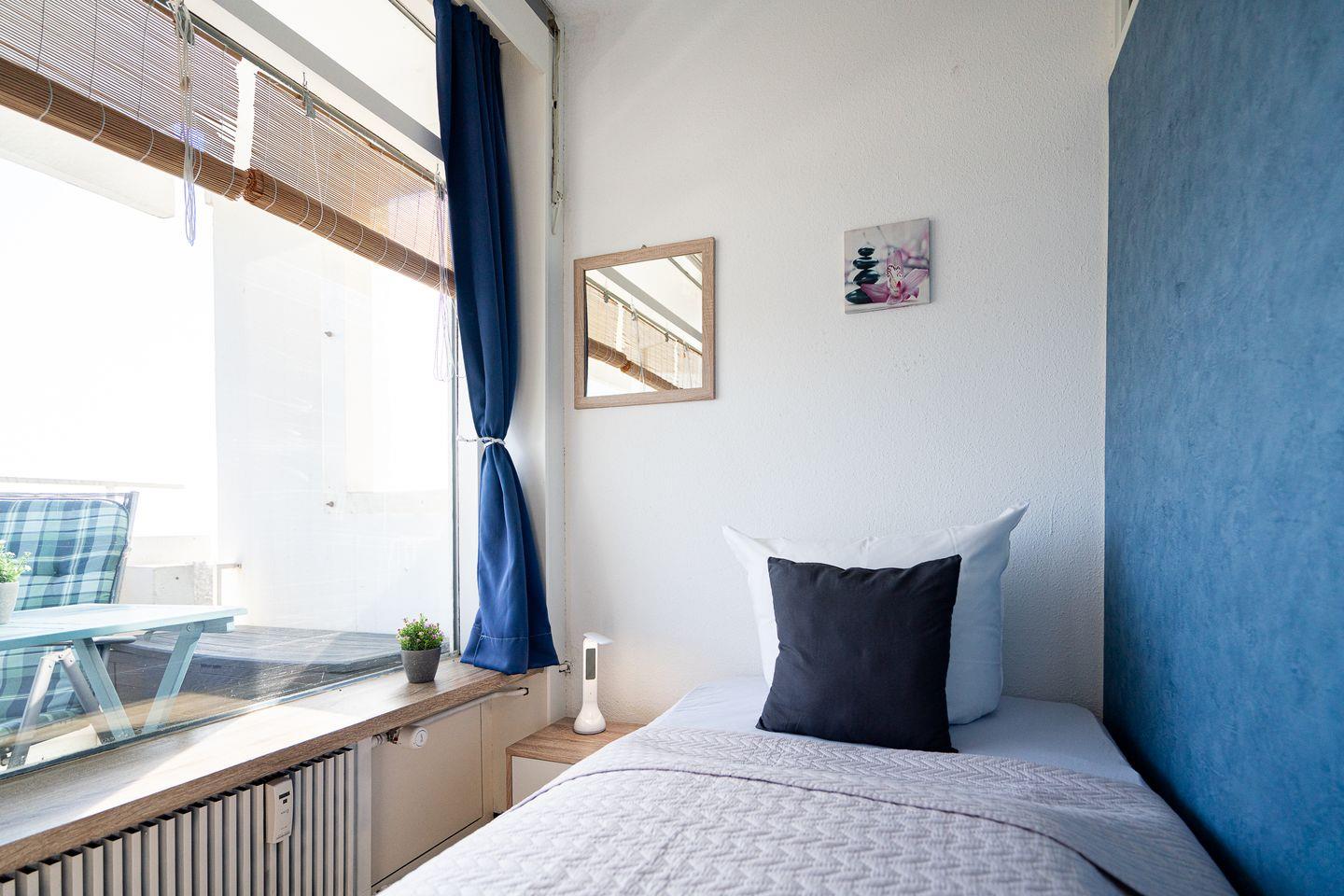 Die Ferienwohnung verfügt über zwei separate Schlafzimmer sowie ein Wohnzimmer mit Sofaecke und Essbereich. Das durchdachte Raumkonzept sorgt für einen angenehmen Aufenthalt auch auf kompakter Wohnfläche. Die beiden Schlafzimmer bieten eine angenehme Rückzugsmöglichkeit: Schlafzimmer 1 ist mit einem Einzelbett ausgestattet (1 x EZB 90 x 200 cm, Verdunklung durch Gardinen) und liegt mit Blick auf den Balkon. Schlafzimmer 2 ist innenliegend, verfügt über ein Kojenbett, welches zu einem Doppelbett (1 x DB 2 x 80 x 200 cm, Verdunklung durch Gardinen) ausgezogen oder als Einzelbett genutzt werden kann.